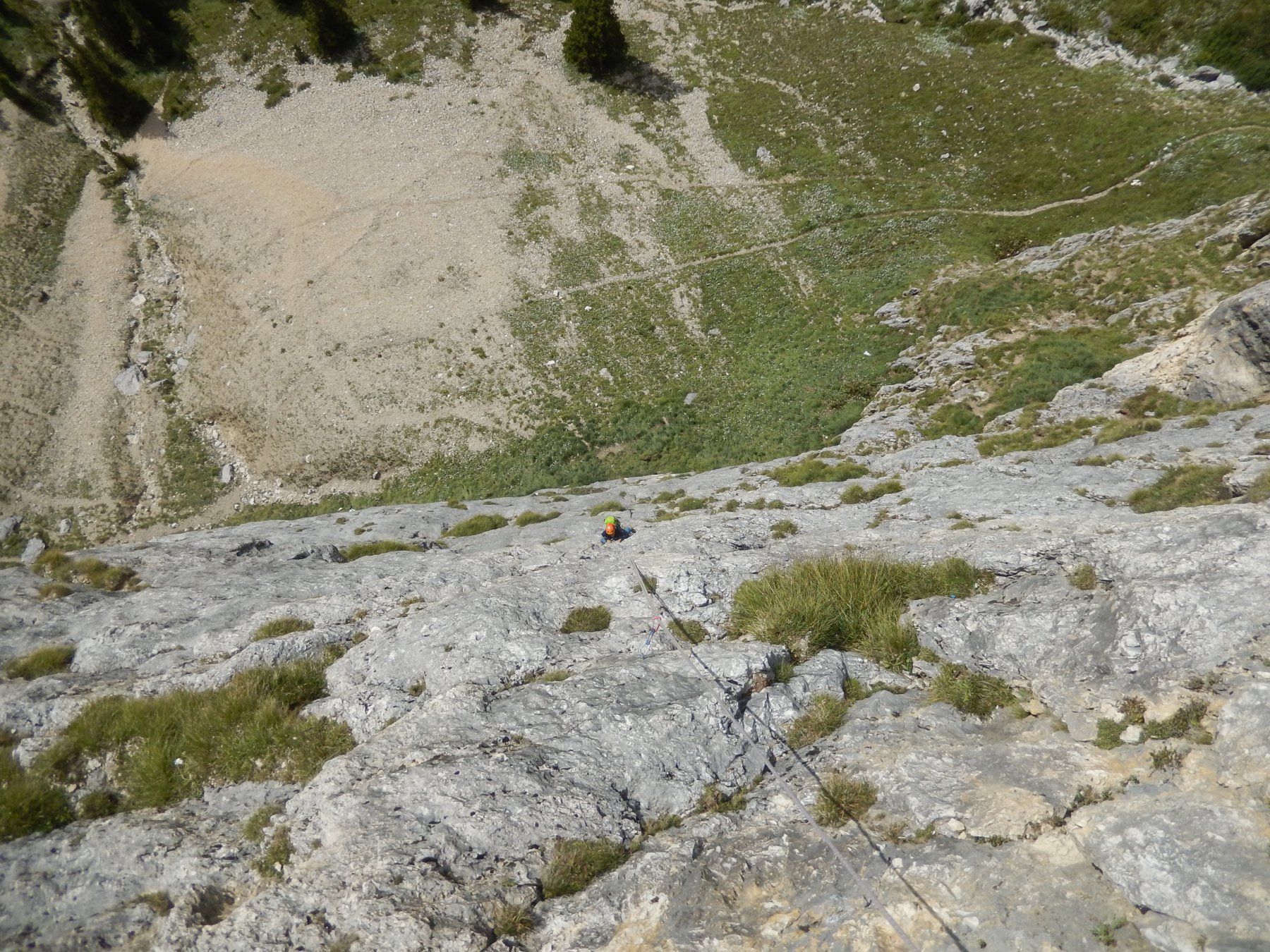 Discesa: in doppia lungo la via, o ancor meglio lungo la normale dalla cengia dei camosci.