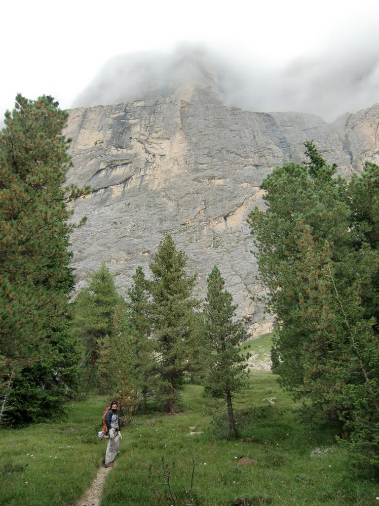 dal parcheggio del Ciavazes, 2080m, per sentiero verso il settore centrale attraverso il bosco e poi per ghiaione all'attacco, nome alla base (0.15h)