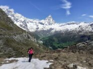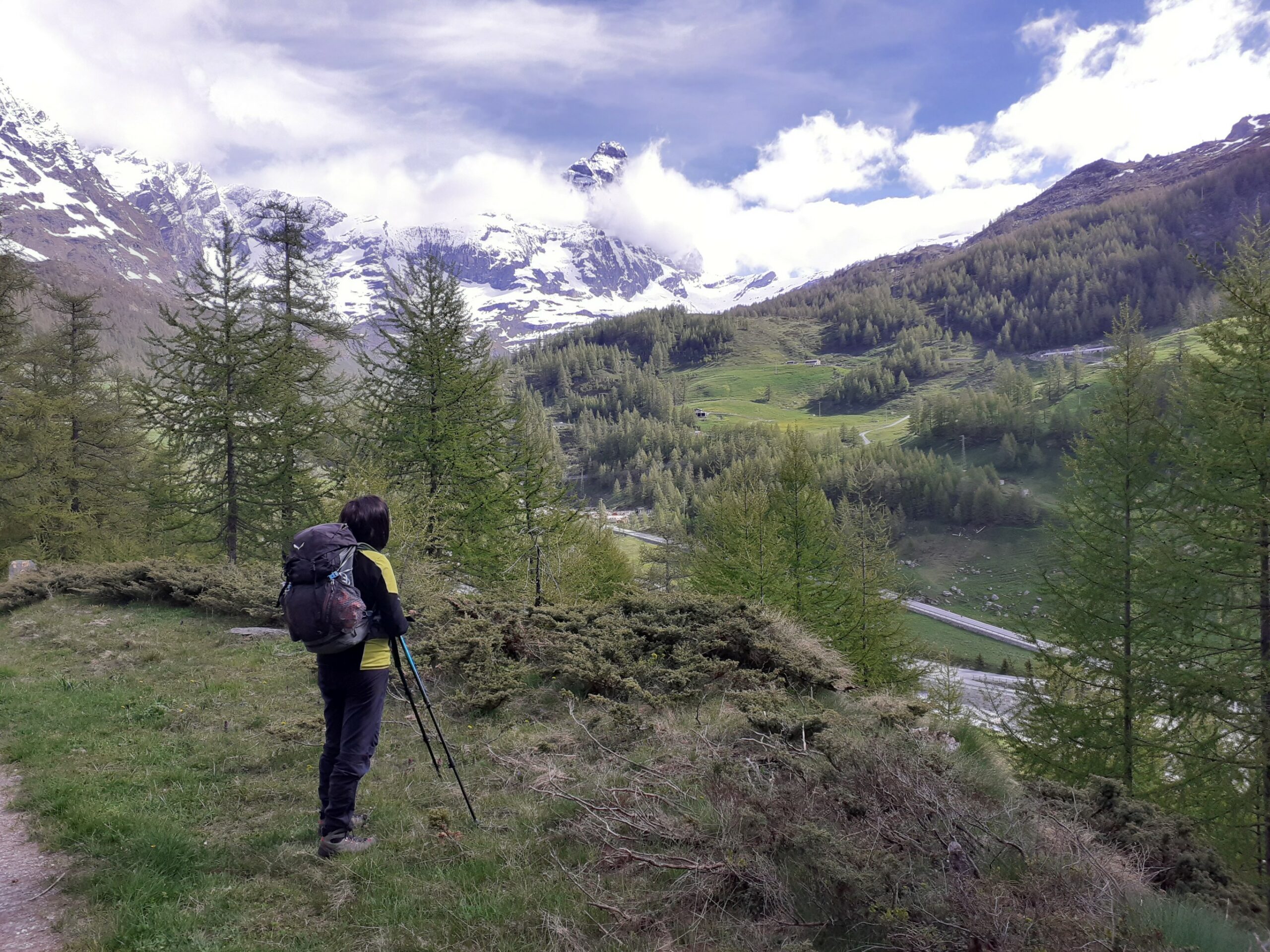 Si attraversa un bel bosco fino ad uscirne ed avendo una splendida vista sul Cervino e su tutta la catena che lo circonda.