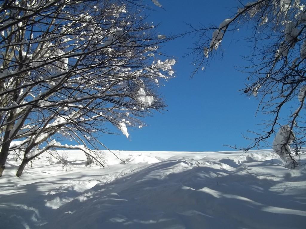Divertentissima discesa per la ‘’direttissima’’ tra i boschi carichi di neve dove, come palle di cannone, cumuli di neve al nostro passaggio cadevano dagli alberi…prenderne uno in testa non credo che avrebbe fatto molto bene!!