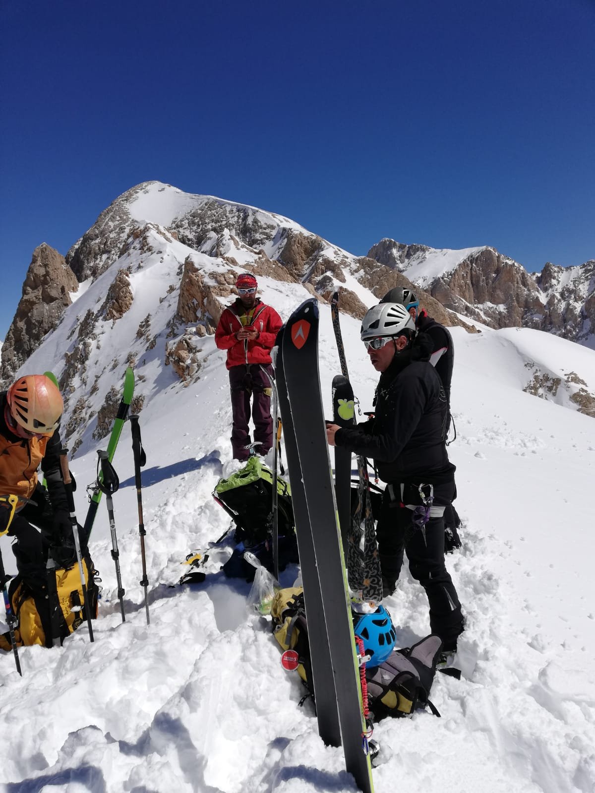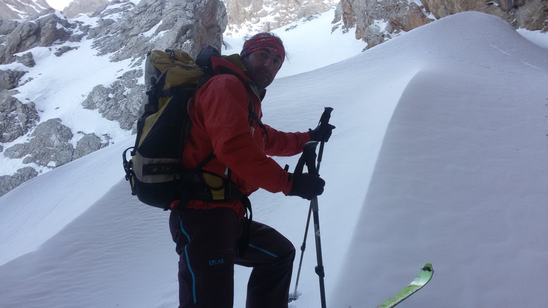 Anche questa volta giungiamo in auto, ora 4×4 indispensabile, alla q. neve, sci ai piedi ci incamminiamo verso l’imbocco della profonda gola di accesso alla Narpuz Valley. Appena entrati togliamo gli sci per salire i 70mt. stretti e con poca neve su blocchi di calcare, usciti dalla gorgia lo spettacolo si manifesta! In fondo al falsopiano la valle sembra precludere il proseguimento ma giunti lì la magnificenza del percorso si fa palese! Intanto la neve farinosa su fondo duro ci fa tracciare in quanto tutto intonso ma, nonostante ciò, abbiamo la forza di commentare ciò che vediamo ad ogni inversione! Salendo la Narpuz, sinuosa e rinserrata da pareti altissime di calcare rosato, ci stupiamo ancora di essere completamente soli. Alla base del lungo e ripido canale da salire per raggiungere il colle 3300, montiamo i coltelli, a metà salita sci a spalle e ramponi fino al colle con straordinaria visione della vetta più alta del gruppo e della discesa che ci aspetta nella Valle di Cimbar. Neve farinosa intonsa fino all’imbocco del canyon dopo molti km, paragoniamo la parte alta al massiccio del Bianco anche se di dimensioni ridotte. La valle si stringe all’improvviso per mutarsi in quel canyon che ci farà rimanere a bocca aperta, ben innevato e sciabile, con pareti che in alto quasi si chiudono. A metà percorso un saltino di pochi mt. formato da grandi blocchi, obbliga ad una corda doppia di 30mt. già attrezzata con cordino in clessidra. Si riprende a sciare agevolmente fino al punto dove il canyon si allarga notevolmente, da lì alcuni ometti indicano il sentiero ormai pulito da fare a piedi (250mt. disl.) fino all’uscita della valle esattamente sulla strada dove è presente un cartellone del Parco. Senza parole.