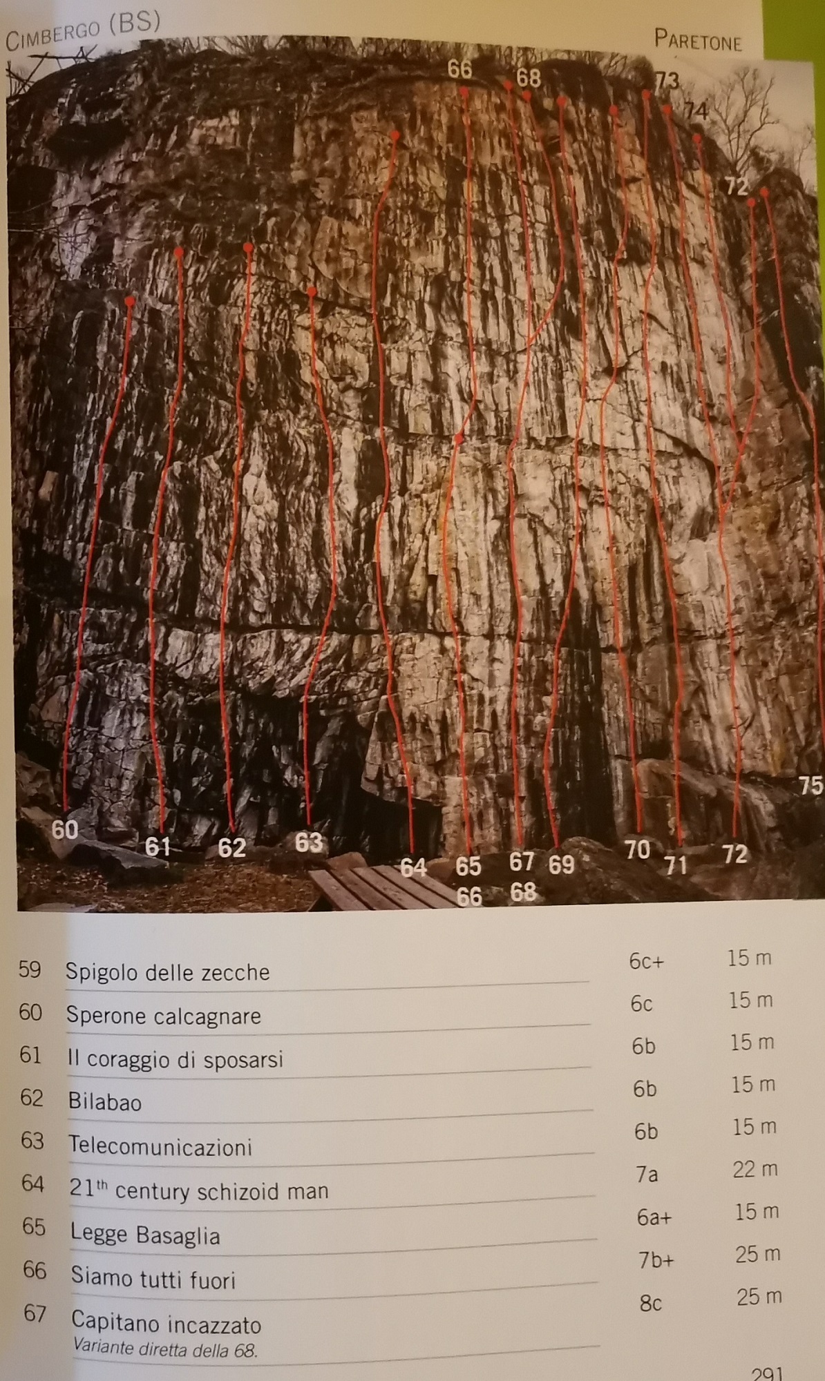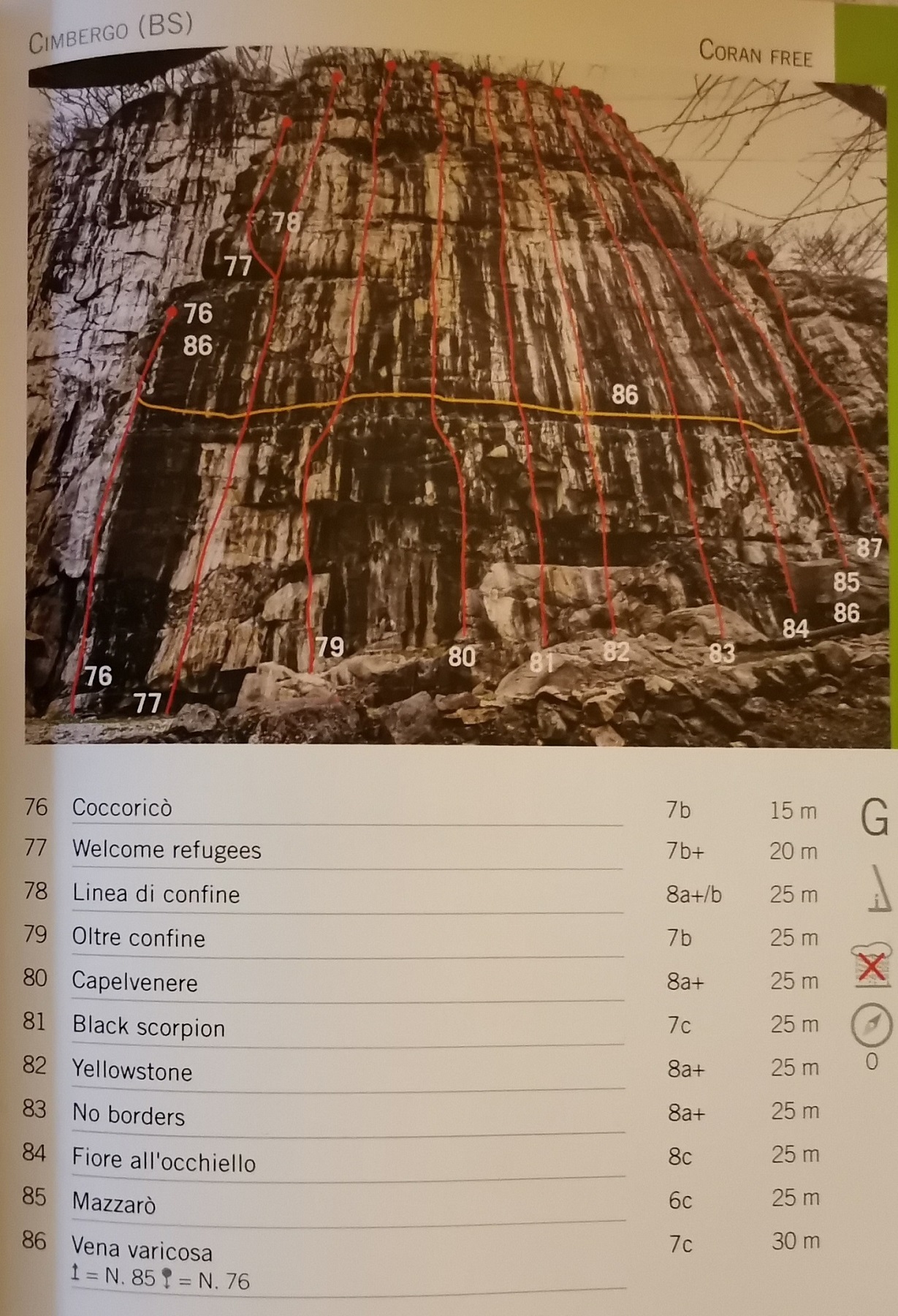 A giudizio di chi scrive, la falesia di Cimbergo è da annoverare tra le più belle di tutta la Lombardia: bella per la scenografia delle quinte di roccia multicolore e di una ruvidità particolare, bella per il contesto, bella la varietà degli stili di scalata, bella per l’inconsueto numero di tiri disponibili, dal livello 4 al 8 e forse qualcosina in più.