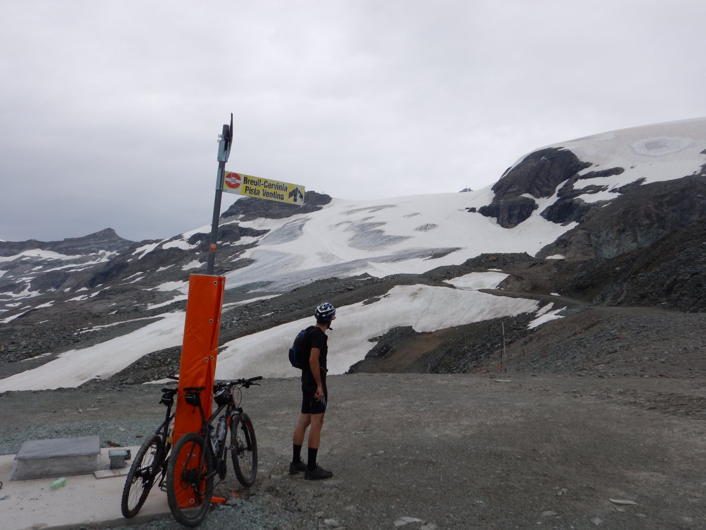 Quindi si sale con la strada asfaltata fino a Cervinia, dove si va fino al parcheggio degli impianti da cui parte una strada sterrata (all’inizio molti tratti sono stati asfaltati) che sale lungo la pista del Ventina. La prima parte ha pendenze molto elevate ma grazie alla presenza dell’asfalto si riesce a pedalare. Si arriva quindi al lago di Goillet, la strada prosegue quindi con ripetuti strappi fino alla partenza della funivia per Plateau Rosà. A questo punto bisogna seguire sulla destra la strada che sale verso il Colle Superiore delle cime Bianche. La strada è sempre tutta abbastanza ben tenuta e pedalabile. Si arriva quindi ad un bacino artificiale usato in inverno per la produzione della neve. Quindi si può scendere direttamente verso Valtournenche, oppure tenere la sinistra per raggiungere il punto più alto 3100 m e affacciarsi sul ghiacciaio del Ventina. In ogni caso la discesa è lungo la strada che passa lungo la pista e gli impianti invernali. Attenzione che il fondo in questo punto non è dei migliori e che la pendenza è molto importante.