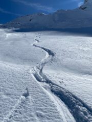 Salita su pista ben innevata (grazie ai cannoni….). Discesa sotto la seggiovia sulle piste non ancora battute andando a cercare i punti poco toccati dal vento: farinella pressata molto godibile. Una volta sulla pista del Ventina, conviene seguirla fino a Cervinia (fuori si trova di tutto). Poche pietre e poche tracce.