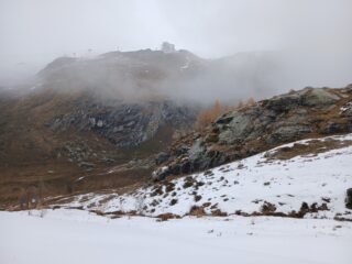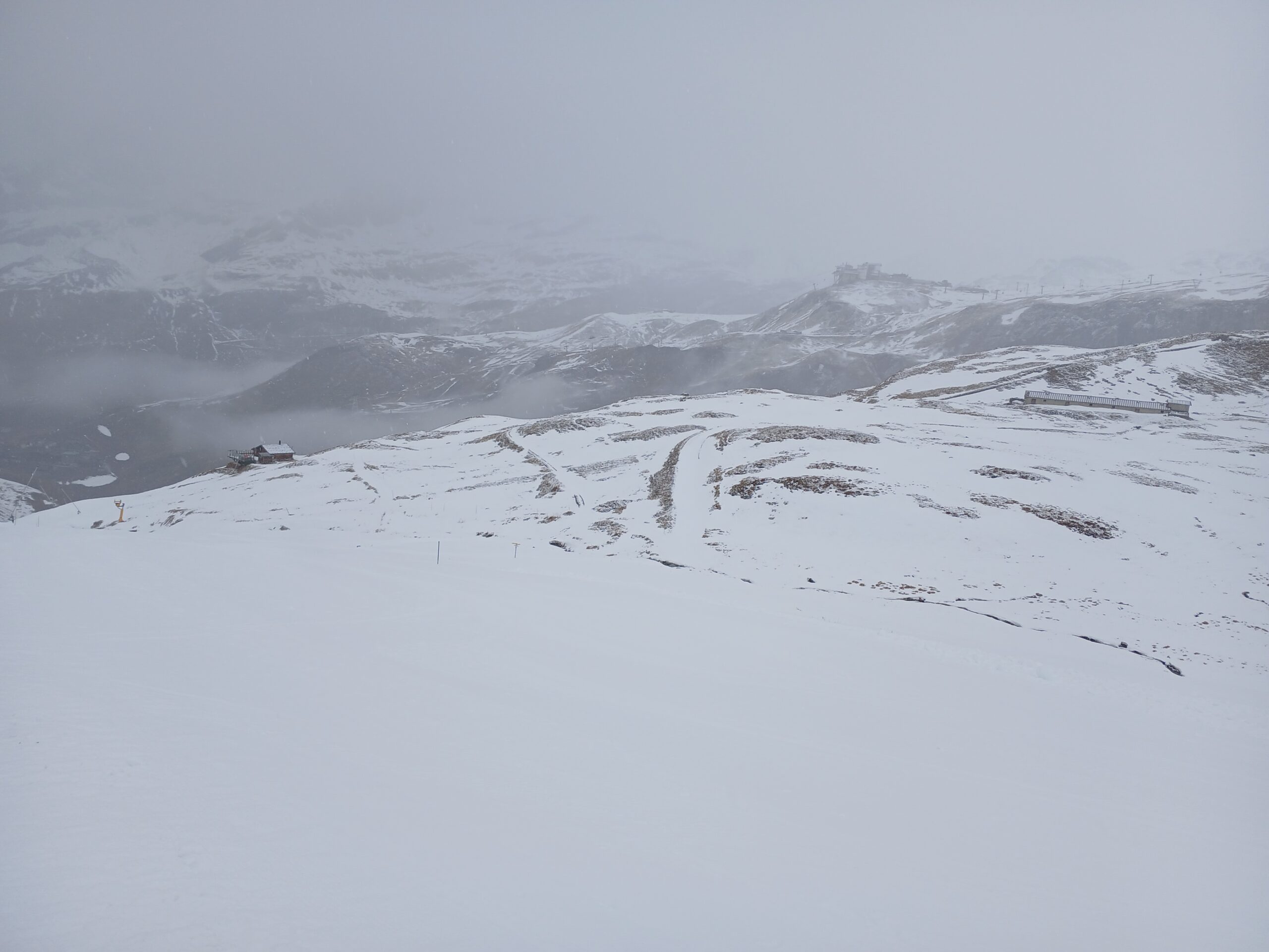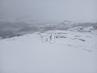 Pioggia e nevoschio a basse quote e scarsa visibilità in alto…partiti da Cervinia sci ai piedi (seguendo il percorso del Ventina ancora chiuso) nonostante l’innevamento molto scarso siamo arrivati oltre il colle superiore di Cime Bianche raggiungendo la Gran Sommetta a quota 3.100 prima di fare retrofront per l’ulteriore peggiorare del meteo. Discesa su piste deserte condizionata da visibilità pessima fino a quota 2.800 poi un po’ migliorata rendendo possibile una sciata divertente con pochi centimetri di neve fresca e umida su fondo in alcuni tratti gelato.