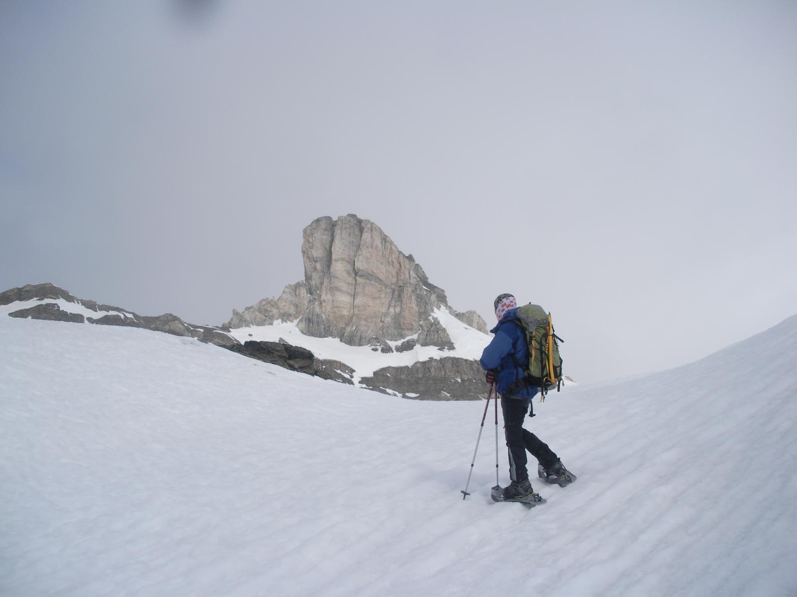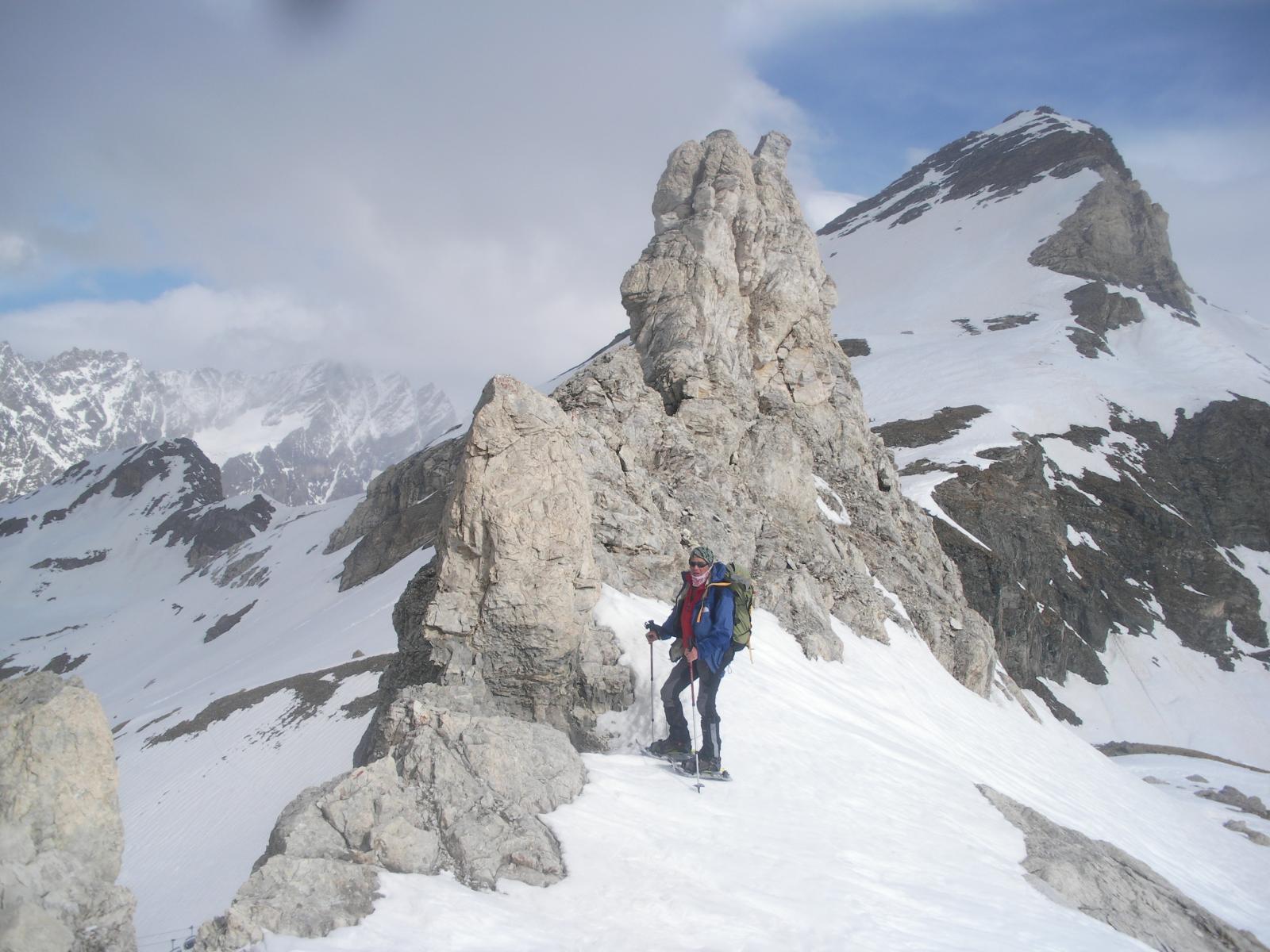 L’obbiettivo era l’Avril da Glacier, ma all’ultimo il meteo ci ha cambiato le carte, consegnando piu’ spazi di sereno in alta val d’Ajas che non dove si doveva andare. Combinazione vuole che la salita alle Cime Bianche da S.Jacques ancora mai fatta, capiti giusto a proposito. Ma non e’ stato un semplice approdo al colle con rientro al seguito. Al contrario animati dal desiderio di salire sempre su qualche cima una qualvolta arrivati in zona, a farne le spese sono state proprio le Cime Bianche. Non solo un nome, bensi due bei torrioni ergentesi sul filo di cresta che dalla Gran Sometta continuando verso sud, si risolleva a formare la possente mole del M.Roisetta (si dice, oggi sia stata presa d’assalto). La dizione corretta e’ Cime Bianche o Bec Carre’ cima nord (3003m), e sud (2973m). Vedi mappa Kompass 1:50:000 Breuil/Cervinia-Zermatt n. 87. Il loro aspetto specie se riferito al torrione nord molto ardito, e’ dolomitico. L’abbiamo salito sfruttando ovviamente il suo lato debole, ovvero dal colle inferiore (aime’ attraversato da un impianto di risalita che pregiudica enormemente la bellezza dell’ambiente circostante), per cengie innevate e canalini, superabili senza grosse difficolta’. Una piccozza e un paio di ramponi sono sicuro d’aiuto. Passare alla cima sud, implica tornare da dove si lasciano gli sci e in traverso esposto alla base del torrione lato Ayas, si guadagna la facile cresta che in breve porta in vetta alla cima sud, di poco piu’ bassa e piu’ massiccia. Malgrado ci siamo attardati a intraprendere la discesa attorno alla mezza, la neve era ancora gelata nella parte alta, ma ci ha messo poco a smollare gia’ a partire da meta’ vallone in giu’. Se ci si attiene al fondo del vallone quello del torrente che lo ha originato, e’ possibile seguendo il pistone che ricalca in pratica il sentiero, giungere sci ai piedi fin quasi sopra le case di S.Jacques (ma ancora x poco). Visto miriadi di camosci distribuiti ovunque all’interno di questo lungo e immenso vallone col Rosa appena al di sopra di esso. Con Franco che con le ciaspole ha fatto del suo meglio.