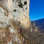 1 – in comune con 1000 miglia; placca di 5c alla ine seguire la corda fissa fino a suo termine per un lungo traverso a destra 55m.