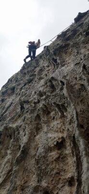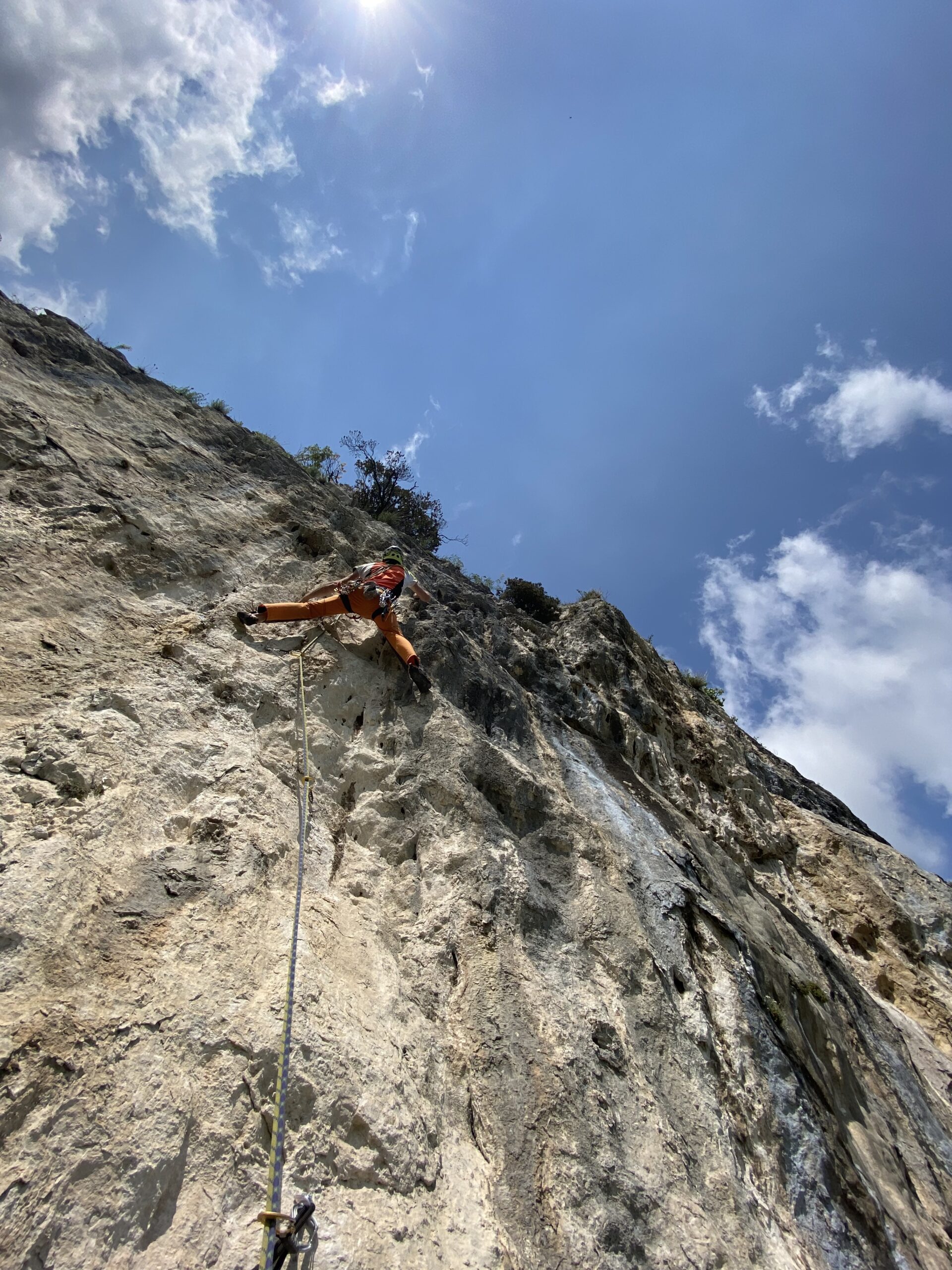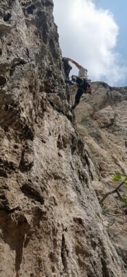 - L6: 20mt 6c, rimontare sopra la sosta, bellissime tacche e concrezioni creano una sequenza di movimenti per nulla banali fino a rimontare l’atletica pancia finale, uscire nei pressi di un cespuglio e sostare in sommità su pianta. Anche qui tiro antologia.