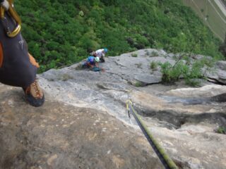 - L3: 25mt III, tiro di trasferimento, rimontare sulla cengia e verso sx dirigersi alla sosta in comune di GEM85. Tiro facile ma esposto. Arrivati in sosta ci si rende conto che da qua la storia cambia.