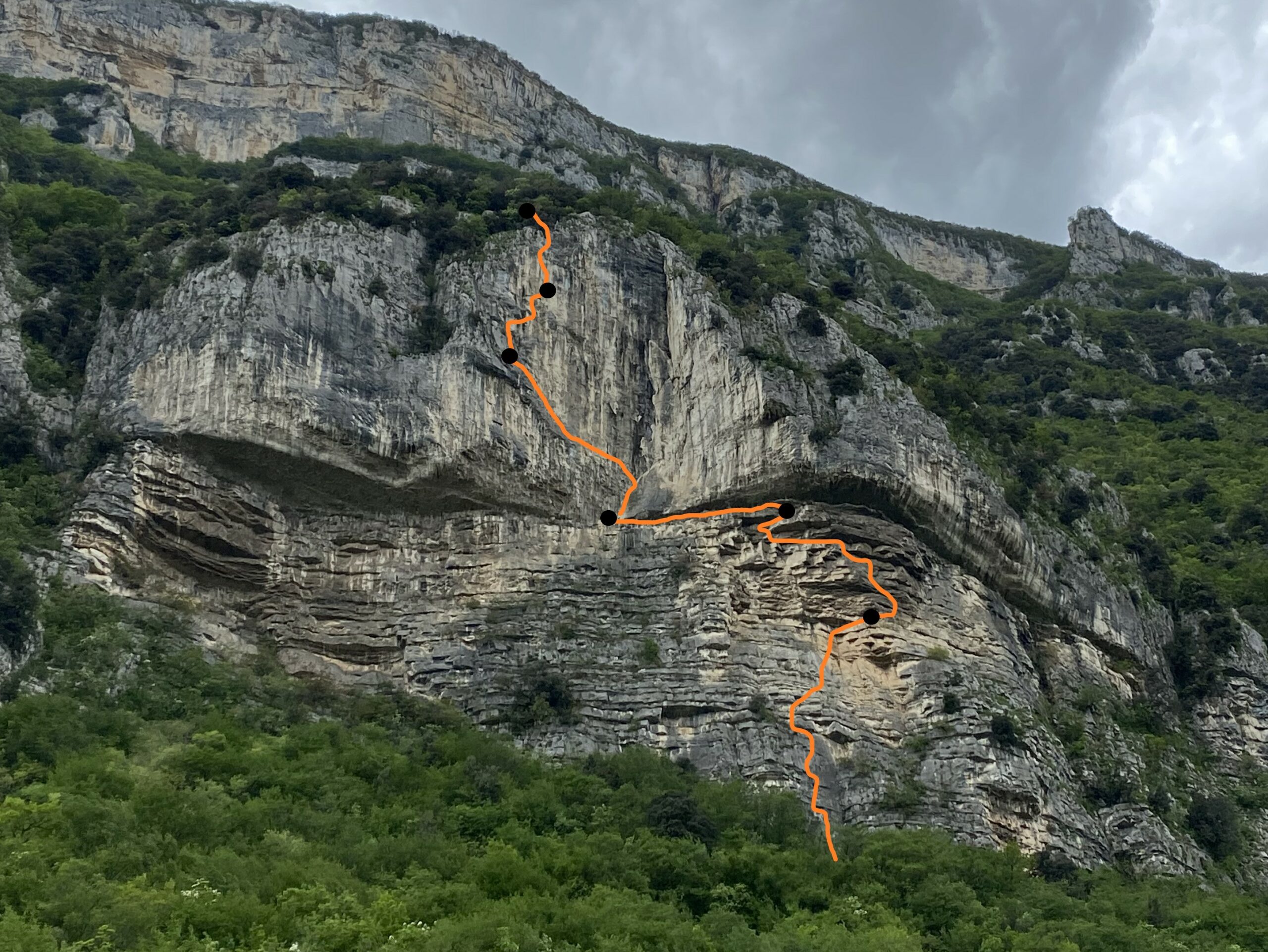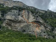 - L1: 45mt 6a+, risalire la placca sempre ben ammanigliata, rimontare un piccolo tettino con passo deciso, virare leggermente a sx zona piante, quindi puntare sotto al primo tetto, mandare giu la saliva, scalare la fantastica placca con coralli a sx del diedro, quindi con breve traverso raggiungere la sosta. Un bel viaggetto per cominciare.