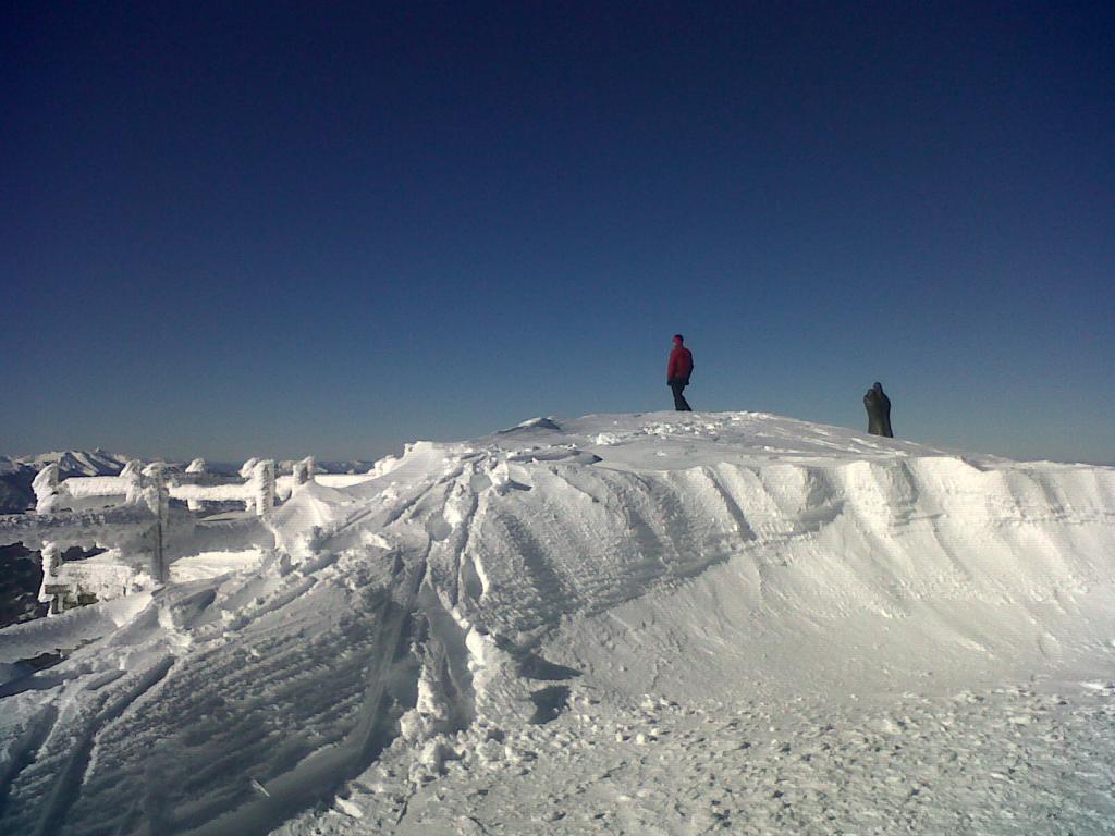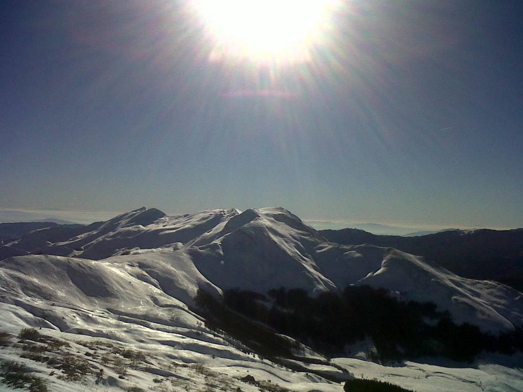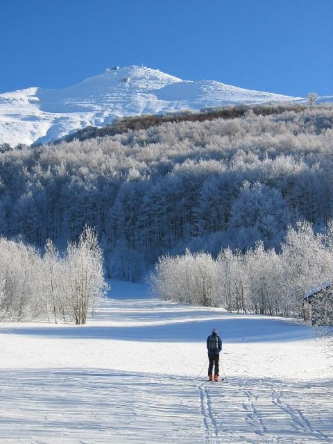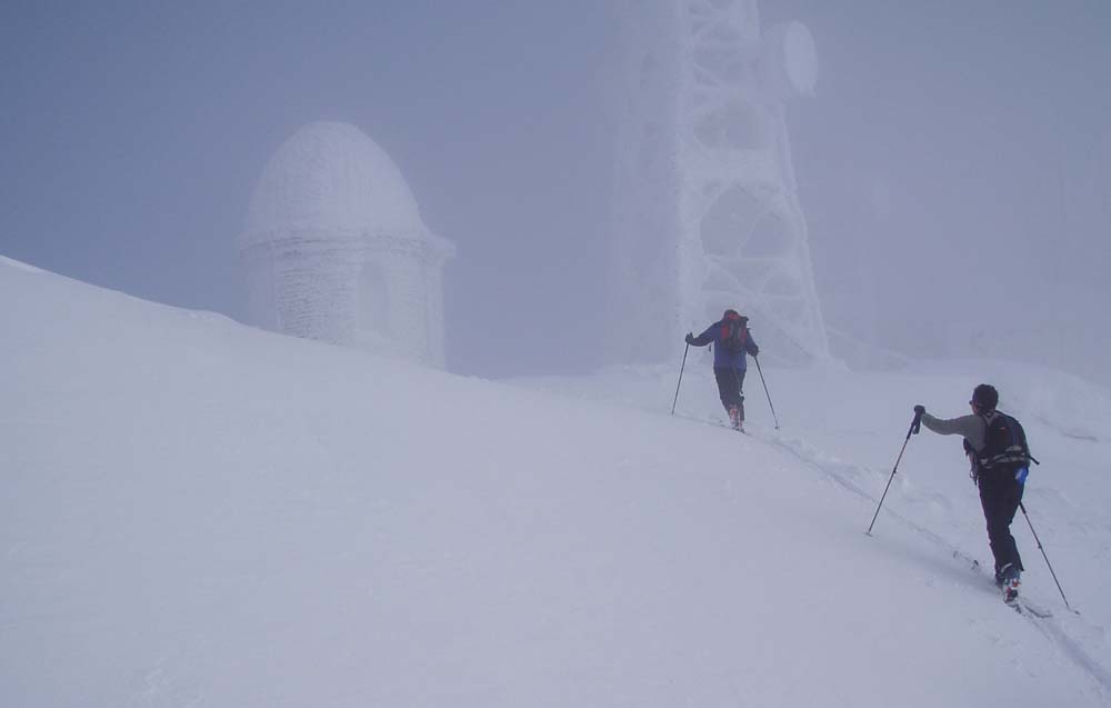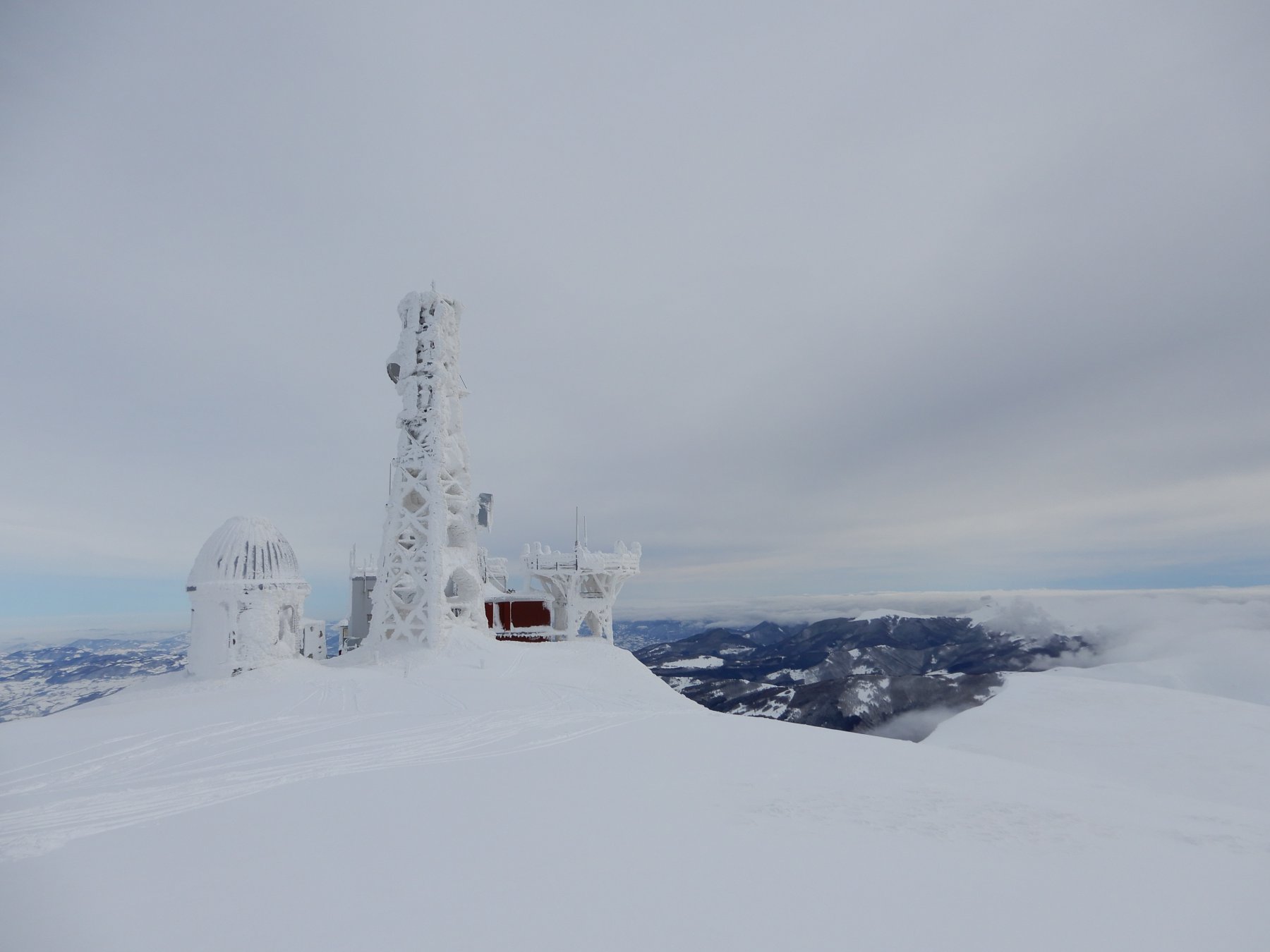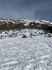 Si giunge ai margini del bosco con sulla destra una vecchia torretta dismessa dell’Enel dove si aprono dei vasti paginoni sottostanti l’evidente vetta sormontata da fabbricati e strutture dell’osservatorio meteo.