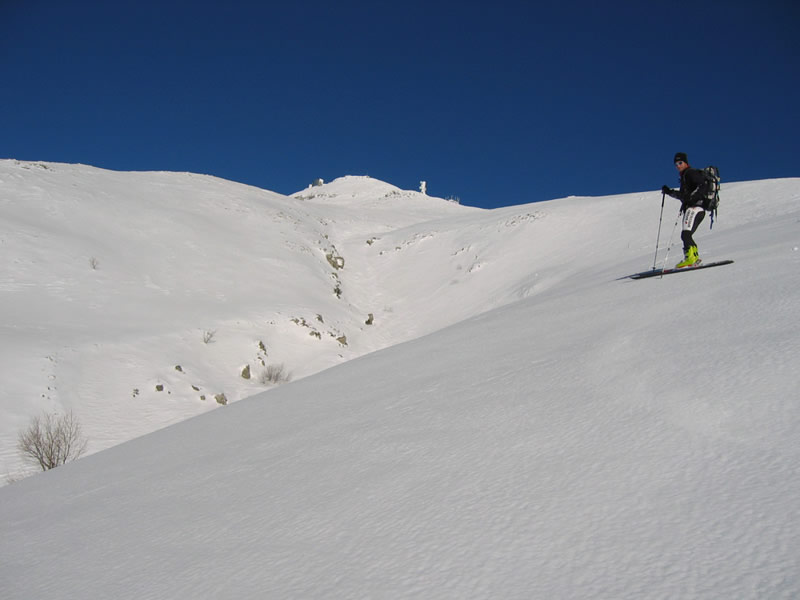 Senza itinerario obbligato, si risalgono questi paginoni tendendo in alto verso destra per entrare nell’ultimo tratto di salita in esposizione sud che porta in vetta.