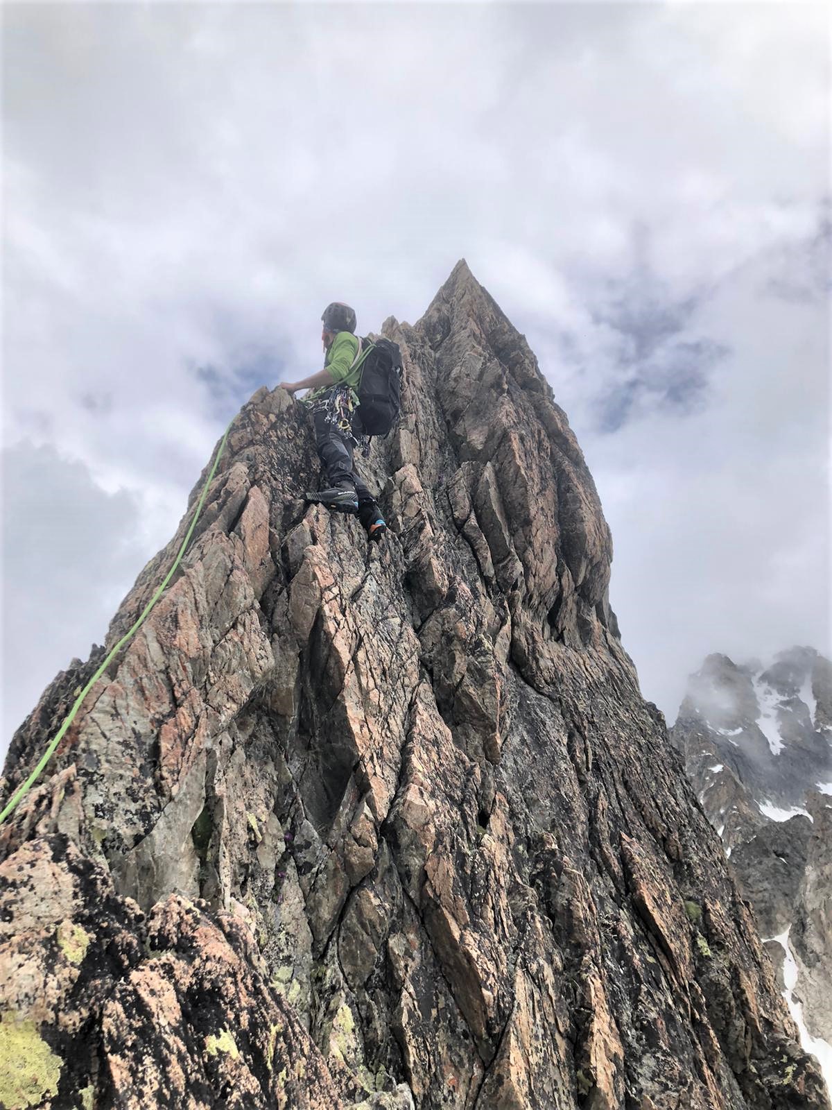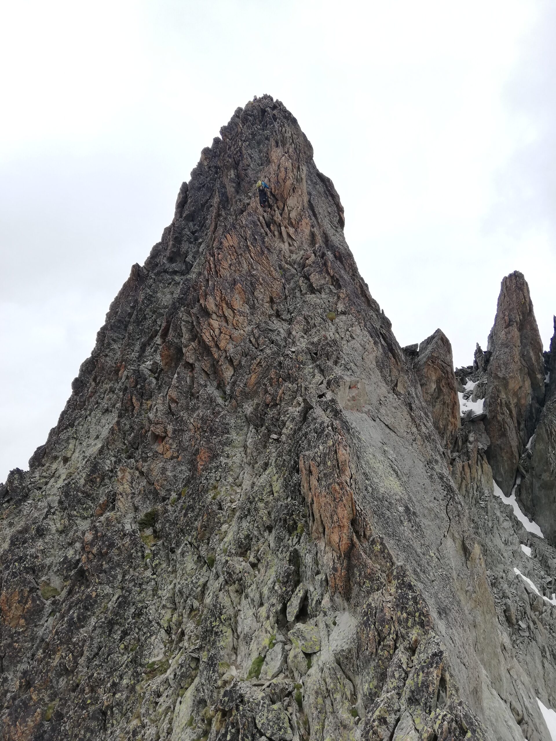 Dalla base salire, con facili passaggi di II e III grado, sul filo di cresta in corrispondenza della prima di sei punte (la punta non si sale). Proseguire sul filo, alla meglio, verso la seconda punta.