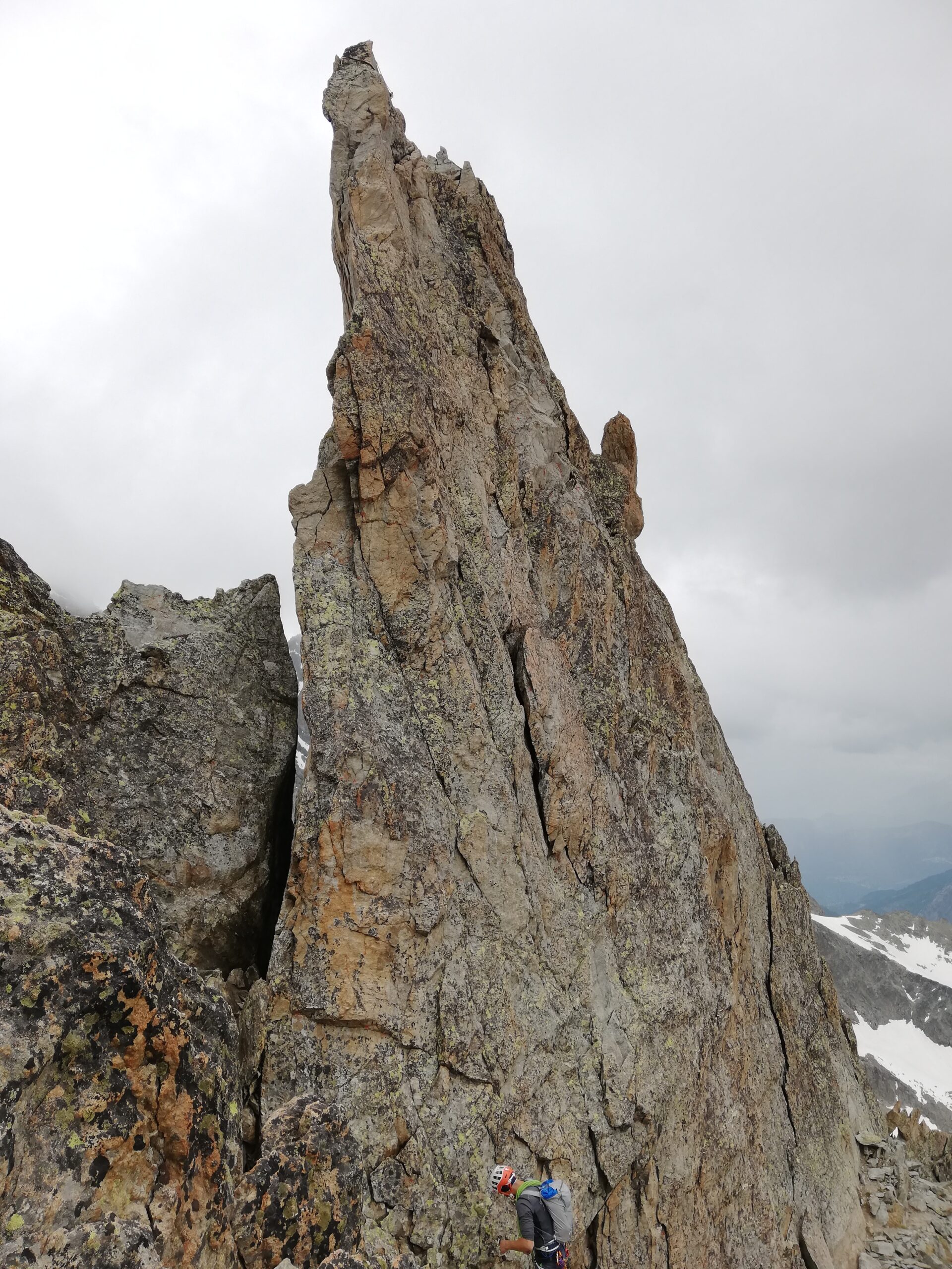 Dalla cima, continuare la cresta e poi subito calarsi verso est (richiesta corda da 50 m). Poi calarsi ancora due volte in successione per finire sul terreno franoso e infido (pericolo caduta pietre) Proseguire alla meglio fino ai nevai / pietraie e da li, in breve, al rifugio.