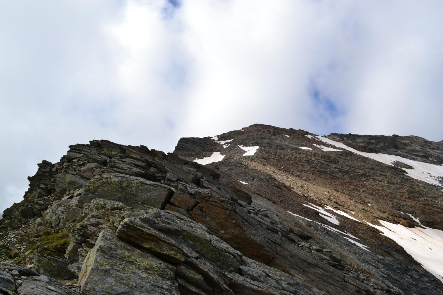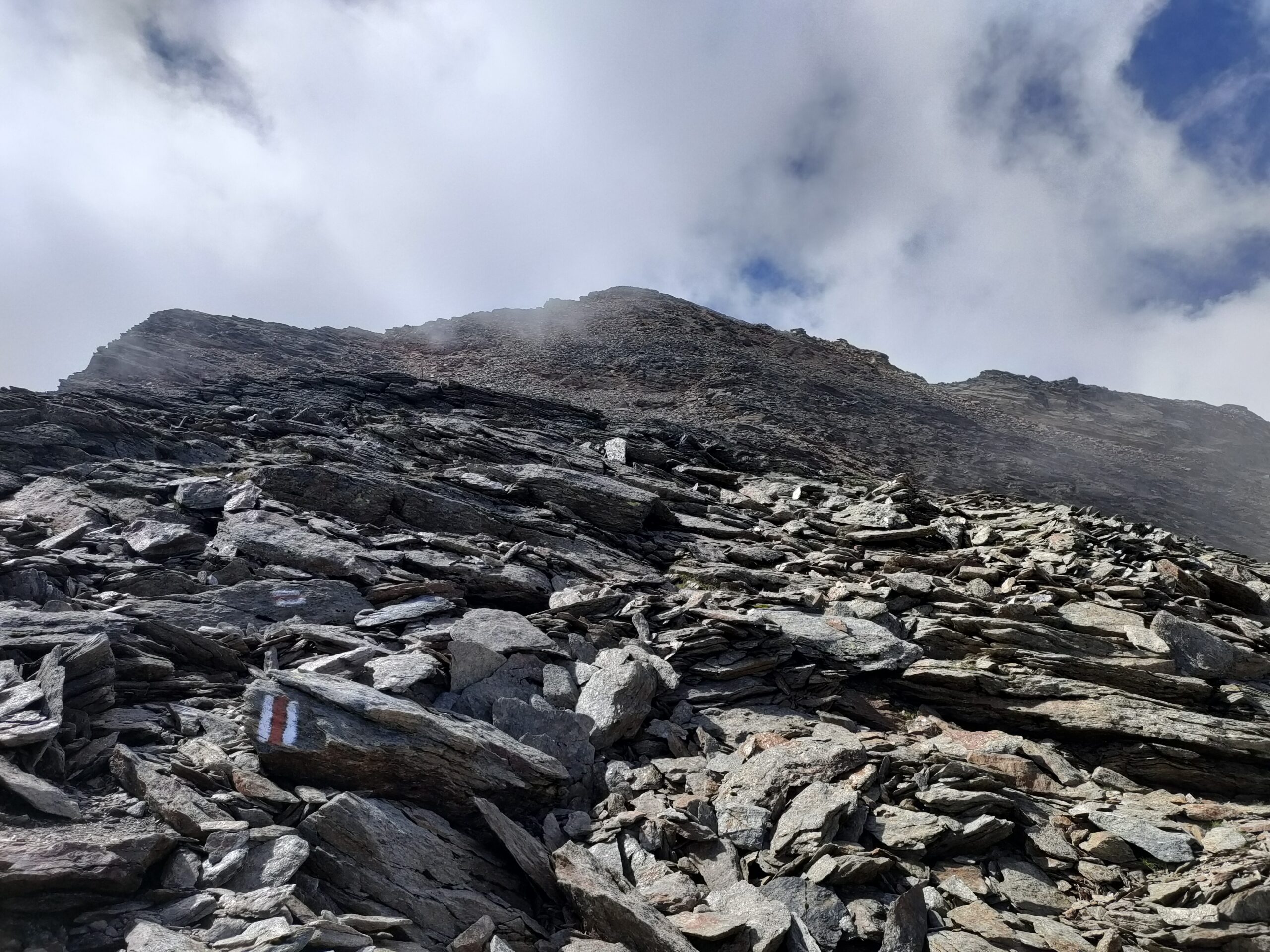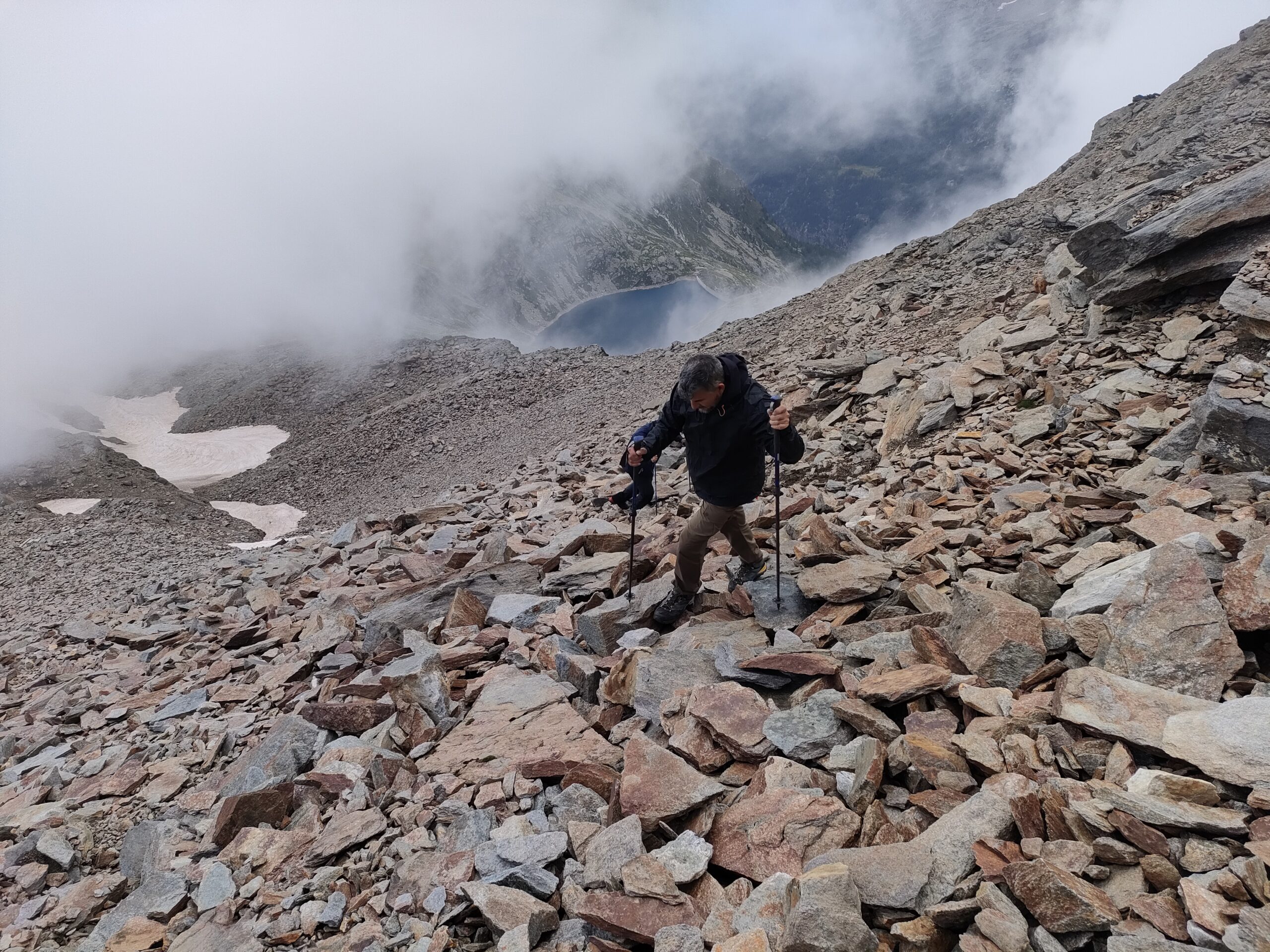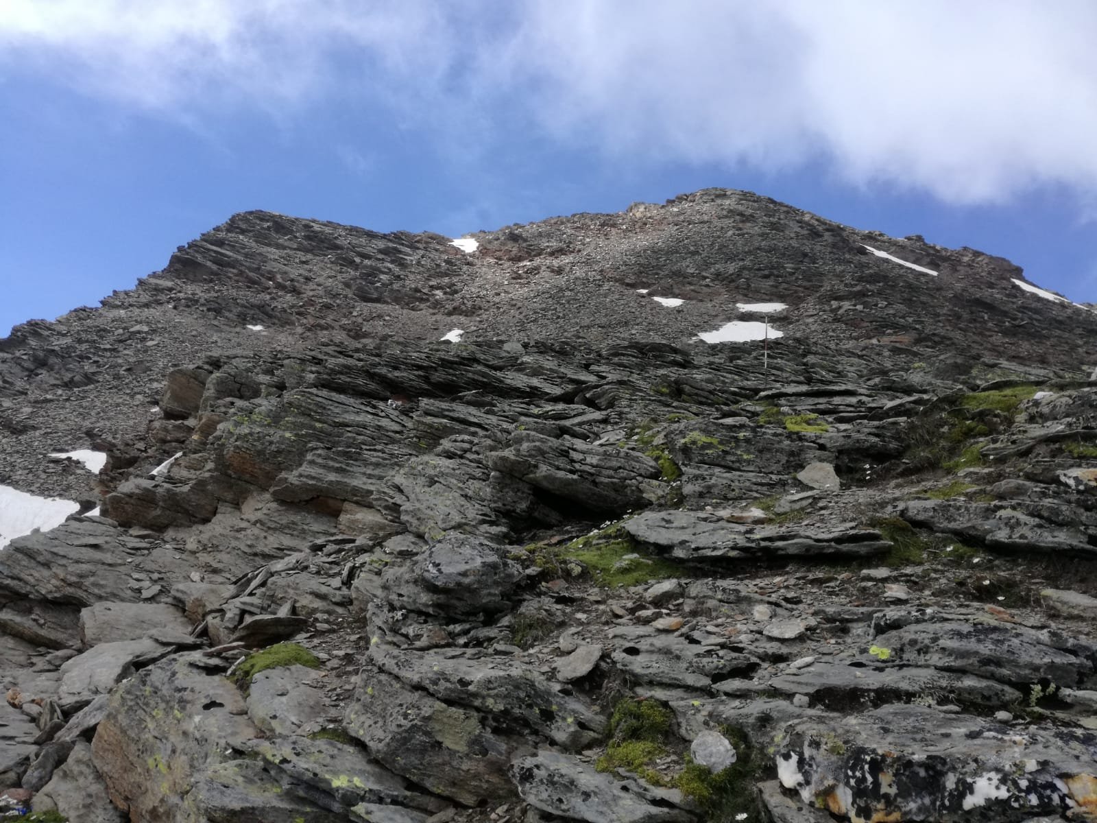 La traccia sale a sinistra tra frane e neve (ometti) passando in ultimo sotto e oltre la fascia rocciosa che sbarra l’accesso diretto al valico. Superare un ripido nevaio e dopo un lungo traverso in piano si arriva al passo (2839 m).