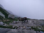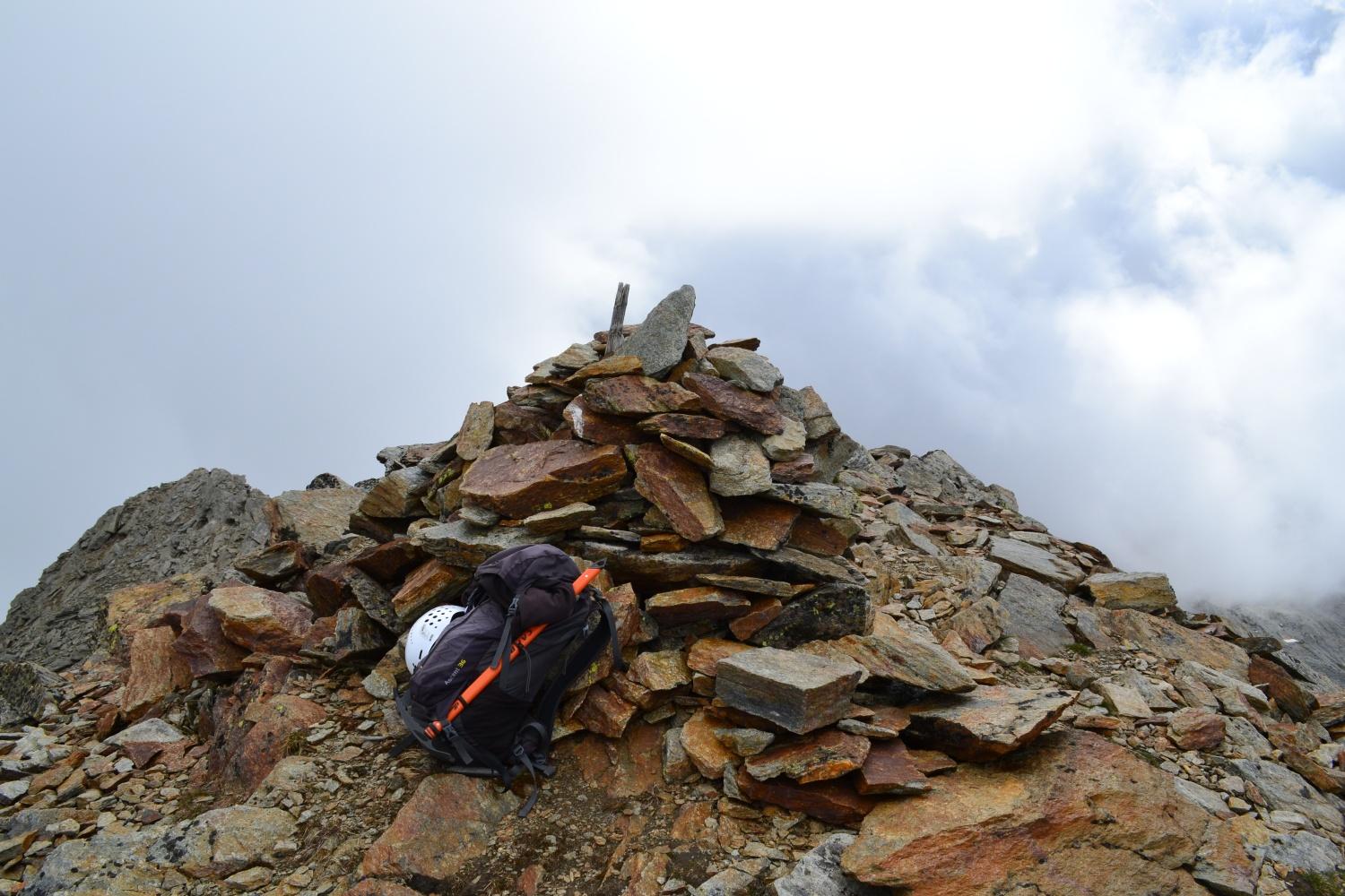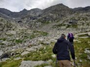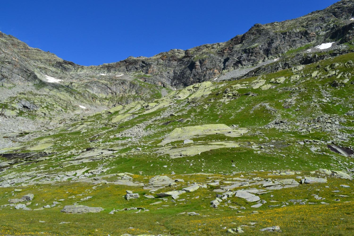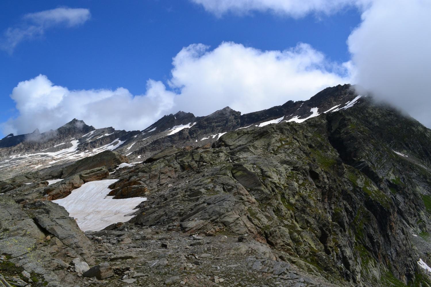La traccia sale a sinistra tra frane e neve (ometti) passando in ultimo sotto e oltre la fascia rocciosa che sbarra l’accesso diretto al valico. Superare un ripido nevaio e dopo un lungo traverso in piano si arriva al passo (2839 m).