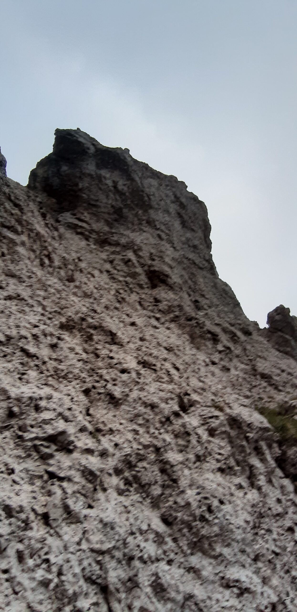 - 4° Tiro: m 20, IV, VI oppure A0, III+, 2 fittoni, 2 spit, 1 chiodo. – salire per la placca e vincere lo strapiombo ben protetto, poi per facile placca fino alla campana sulla cima dove si sosta.