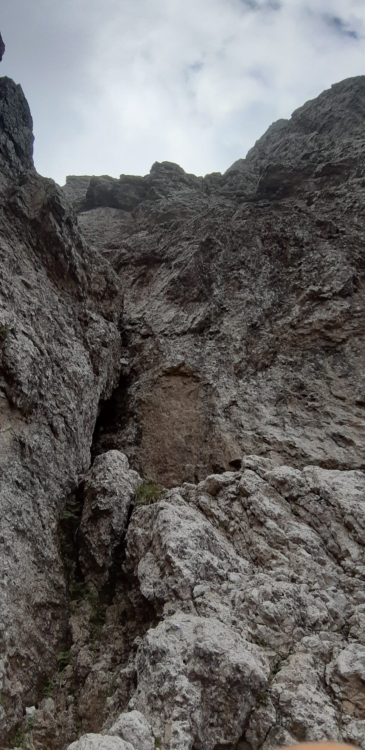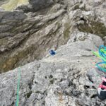 - 3° Tiro: m 35, III+, V, III+, 3 chiodi, 3 fittoni – Seguire la fessura sovrastante fino una placchetta che si supera con l’aiuto di una fessura sulla sinistra. Poi si entra in un’altra fessura, si supera il muretto e si segue la rampa a destra fino alla sosta..