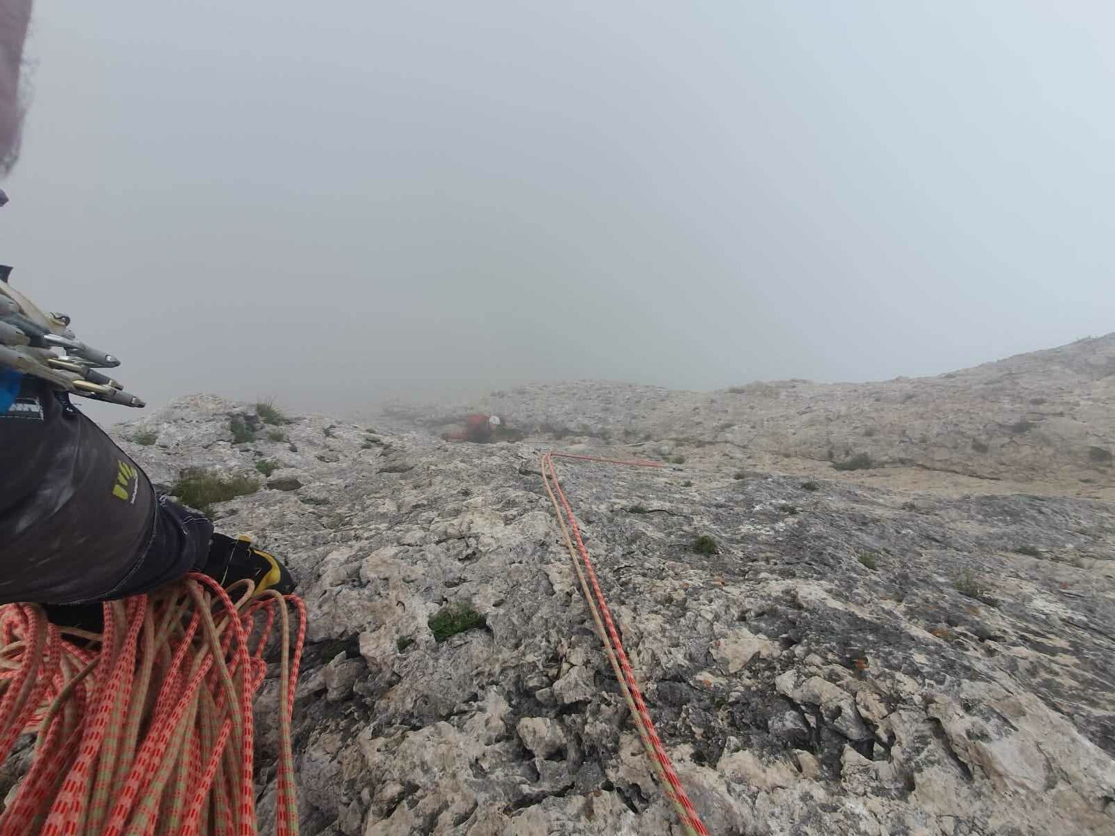 - L4 – VI-, 20mt – Dalla sosta traversare a sinistra fino al diedro, salire per qualche passo, infine destra sfruttando dei bei buchi.