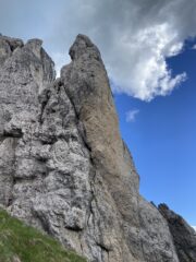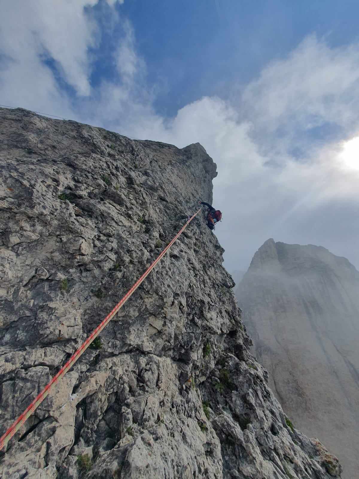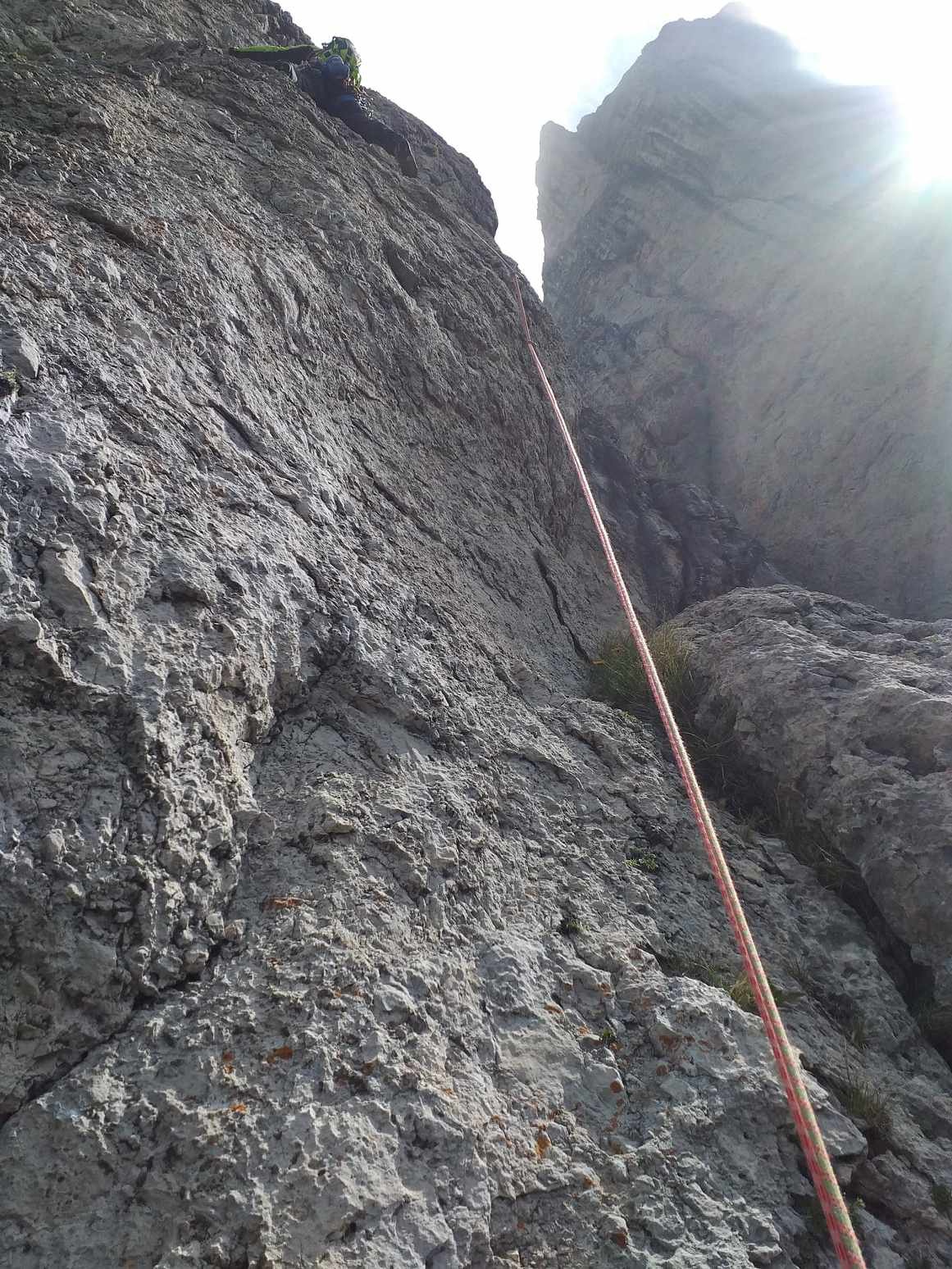 - L5 – 6a+ o V+ A0, 30mt – Dalla sosta salire in verticale fino al fittone. Spostarsi quindi leggermente a destra fino a superare con passo deciso un piccolo strapiombo (passo di 6a+).
