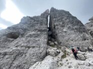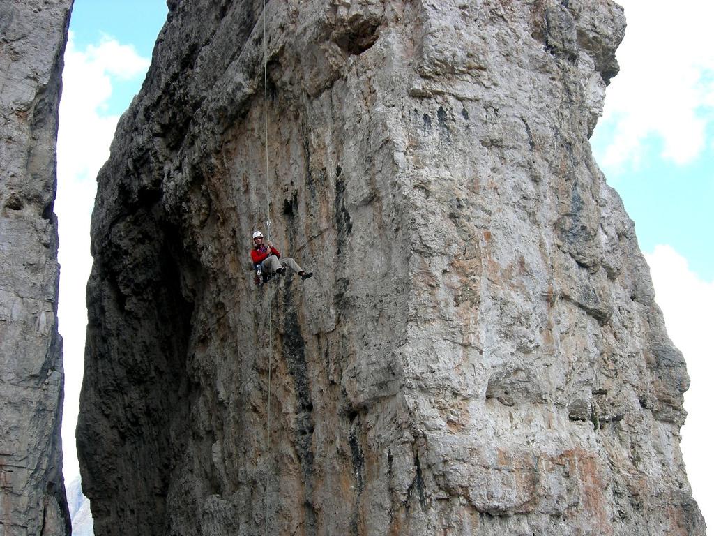 dalla cima scendere arrampicando (secondo grado) per alcuni metri sul versante Ovest. Giunti ad una cengia, si effettua una calata aerea di 40 metri che vi farà atterrare su di un masso alla base della parete. Fare attenzione al nodo di giunzione: s’incastra facilmente!