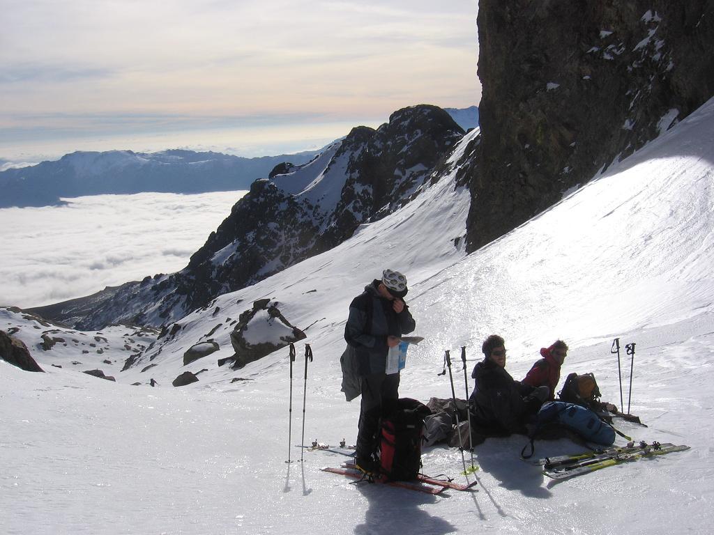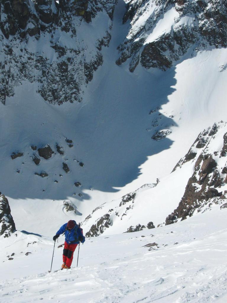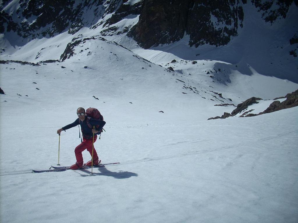 per l’itinerario di salita oppure (dipende dalle condizioni della neve) direttamente sui canaloni che scendono dalla cresta del Cinto verso il rifugio. Dal refuge de l’Erco al dosso sopra la bergerie puo’ convenire di rimettere le pelli.