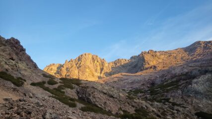 Da qui, in pochi minuti di tecnica di corda corta, si raggiunge la cima del Monte Cinto per facili roccette.