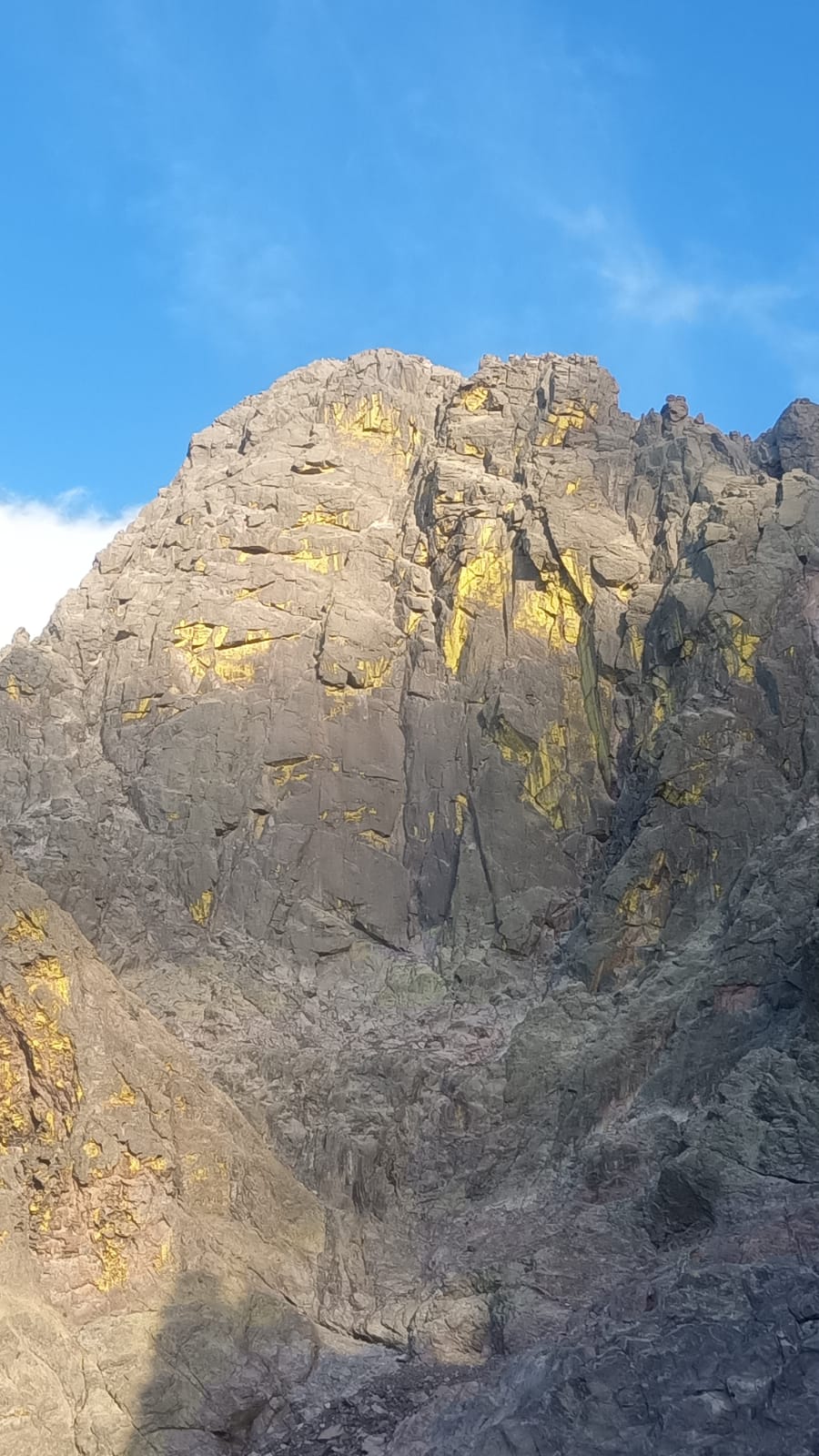 Abbandonare a questo punto il sentiero in direzione dell’evidente parete Nord-Ovest de Monte Cinto dove si trova la via.