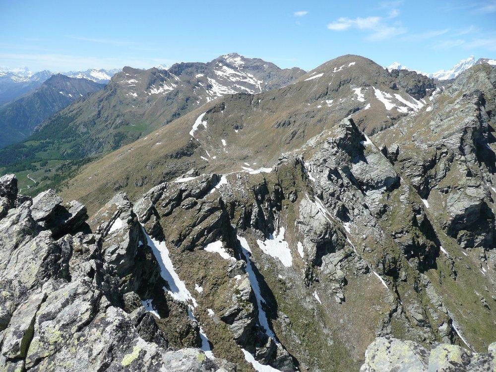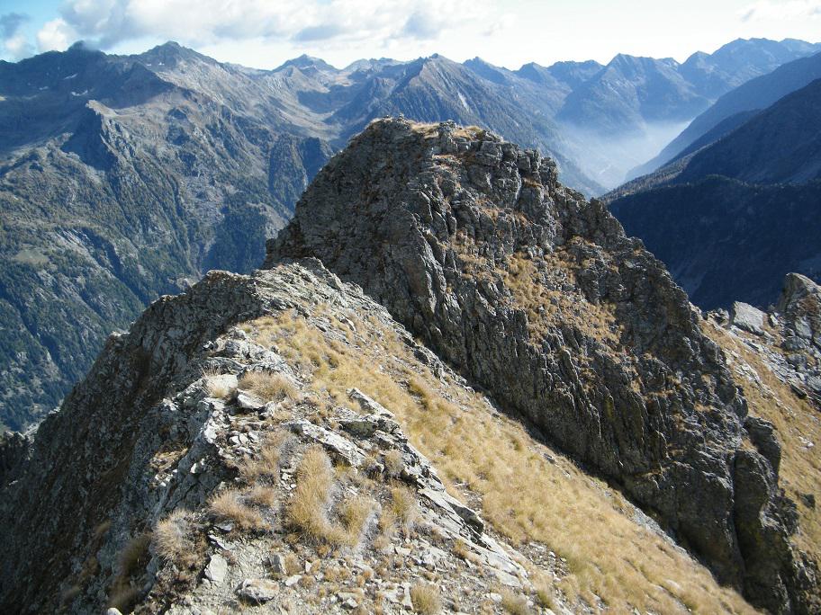 Ripresa la cresta, rimontarla verso un rilievo preceduto da un palo infisso tra le rocce. La cresta, facile, alterna tratti di zolle d’erba ad altri di affioramenti rocciosi.