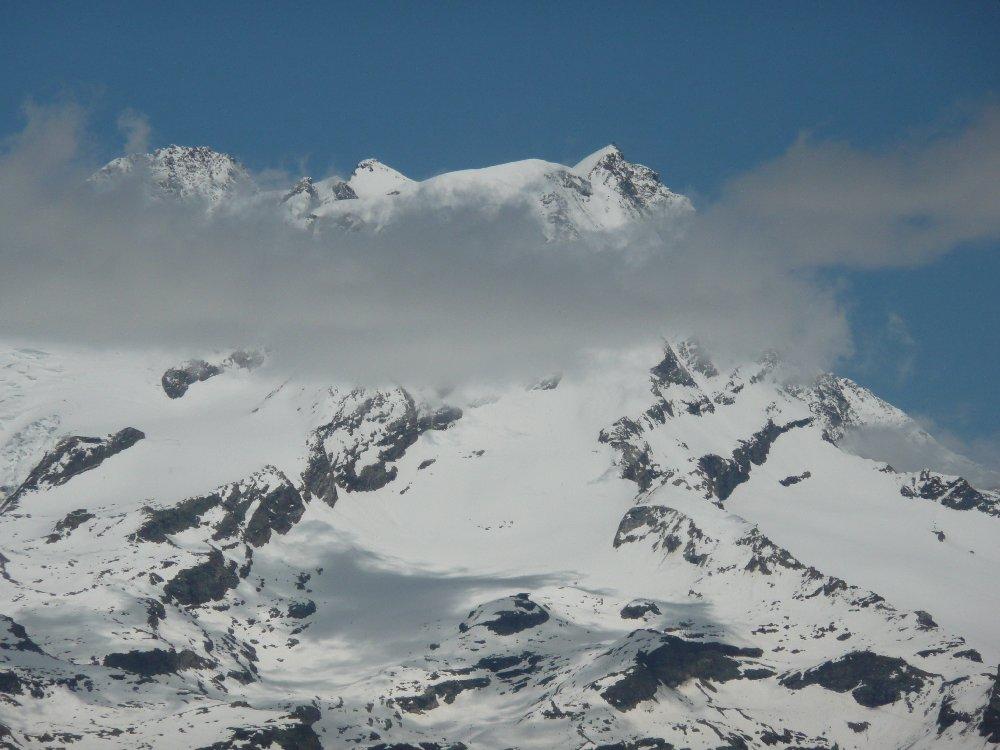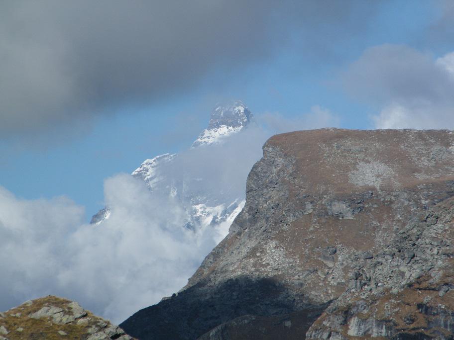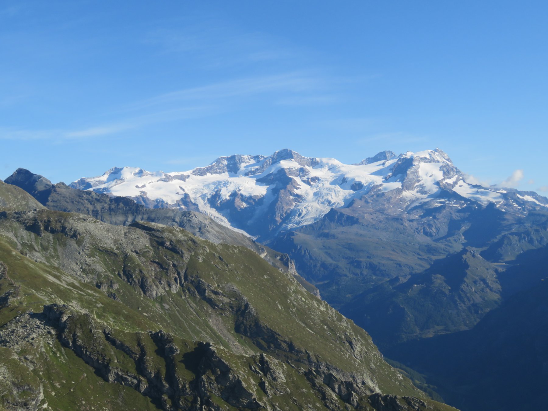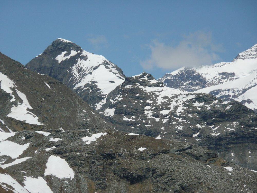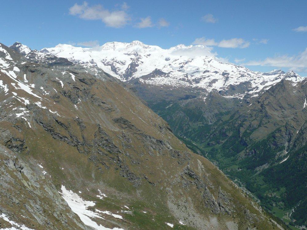 Dopo 15 minuti il sentiero compie una diagonale sul versante O della cresta per evitare un modesto rilievo, si riporta in seguito sul filo e tocca in breve un secondo cocuzzolo (si vede la P. Gnifetti con Capanna Margherita). Discesi ad una depressione, salire in diagonale il pendio erboso sulla sinistra del crinale.