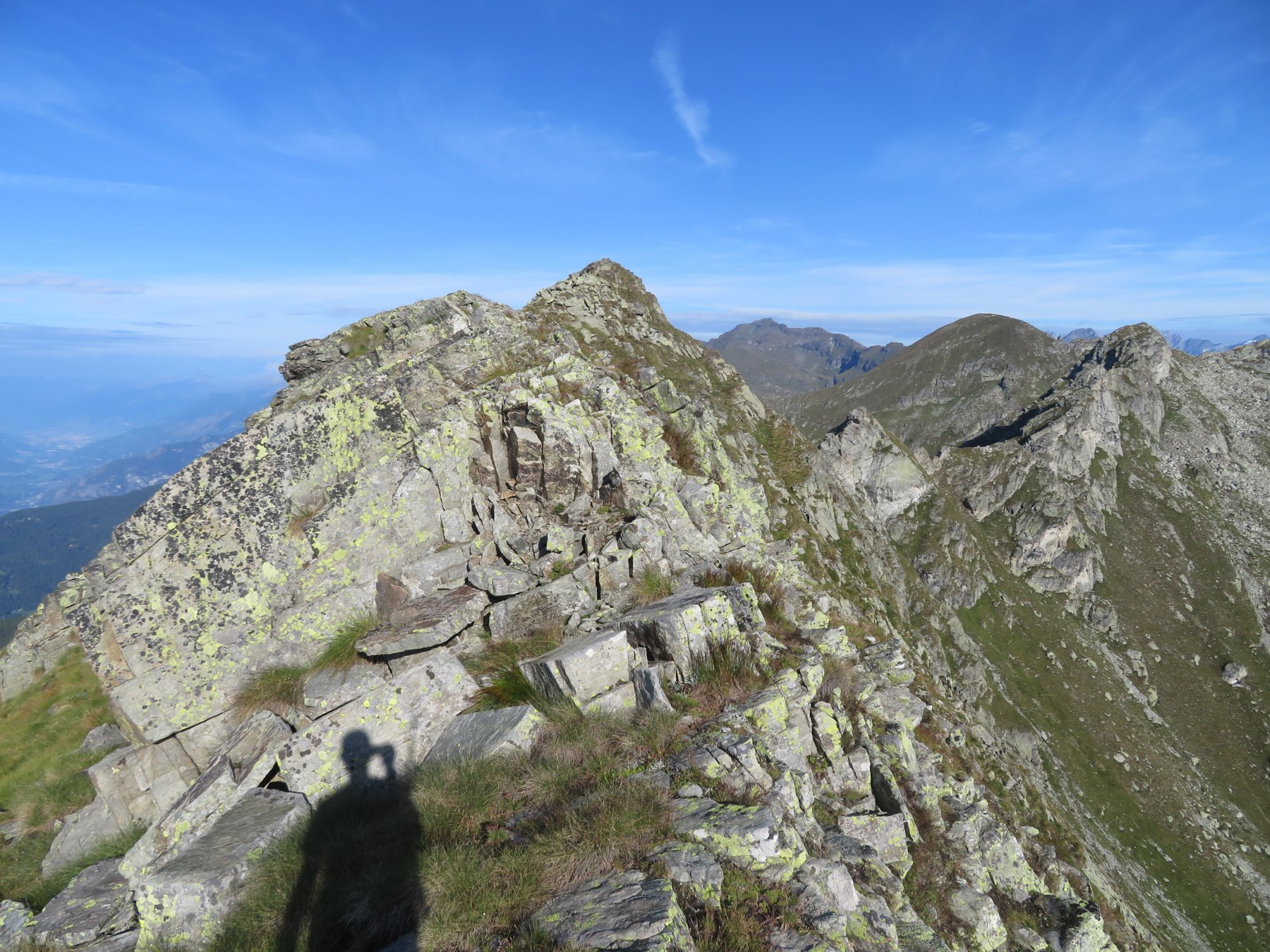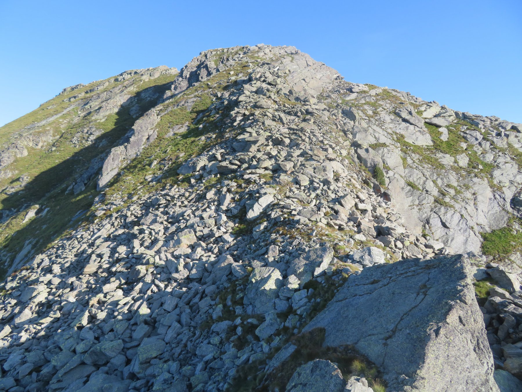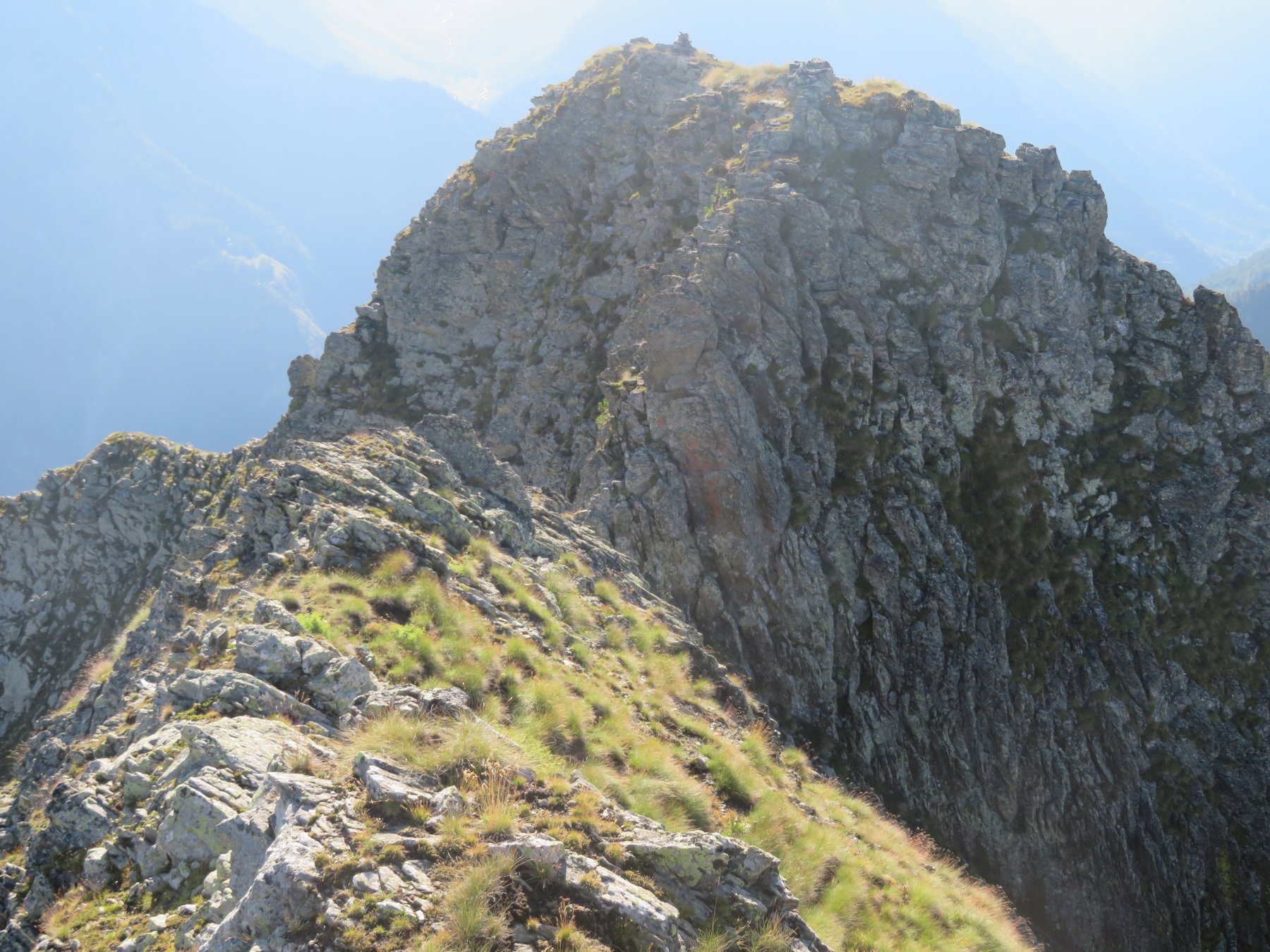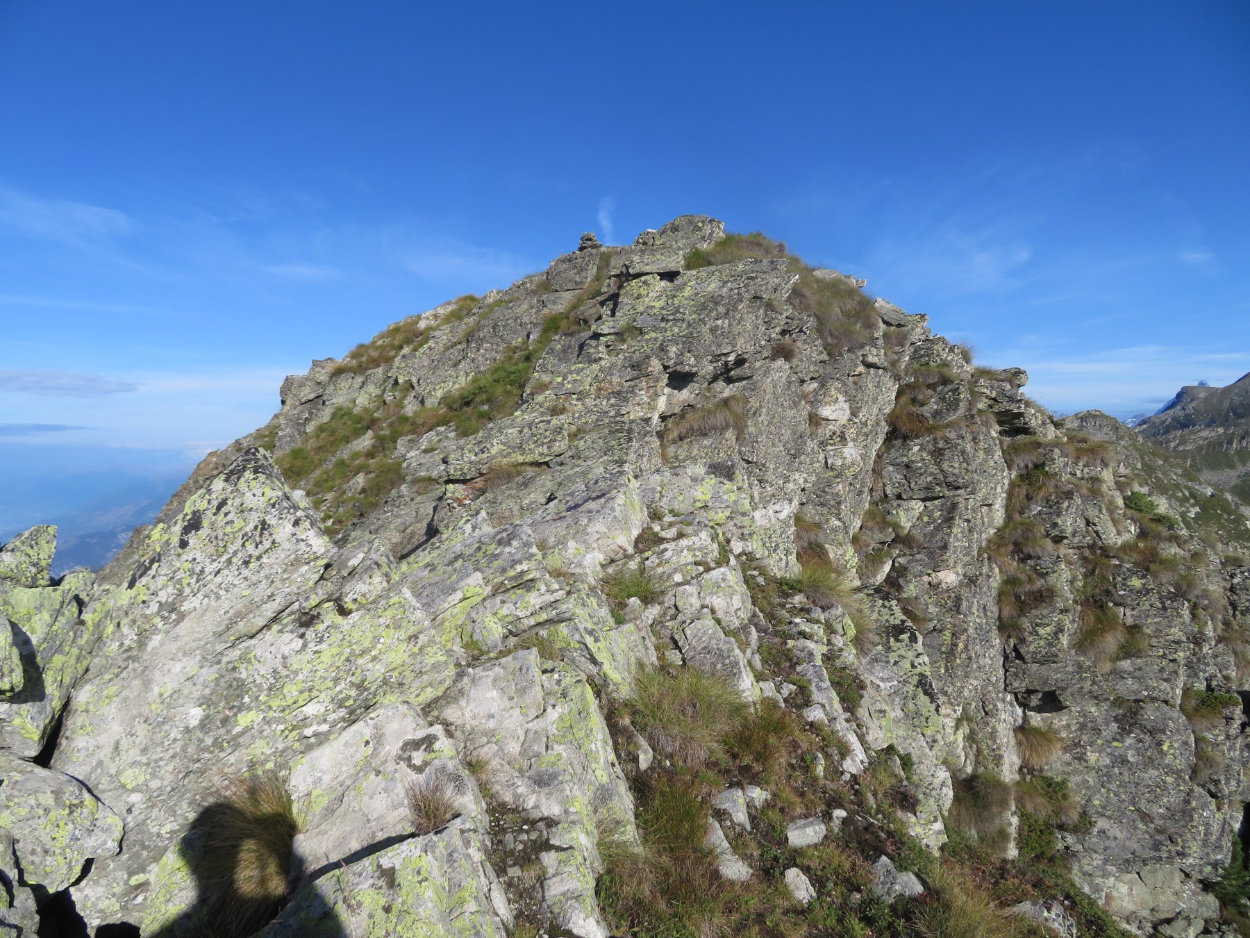 Quasi subito s’incontra un breve passaggio in discesa, su rocce abbastanza ripide ma articolate (7-8m I+ esposto), che bisogna scendere per toccare un colletto. Nel tratto seguente fino alla vetta si percorre la cresta di rocce affioranti ed erba.