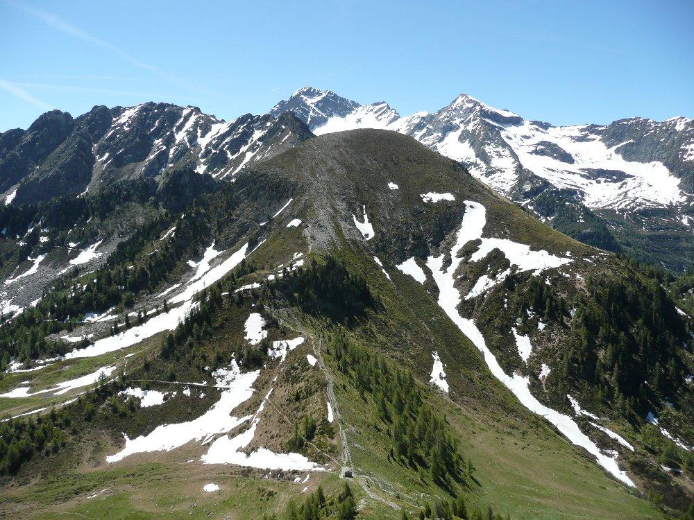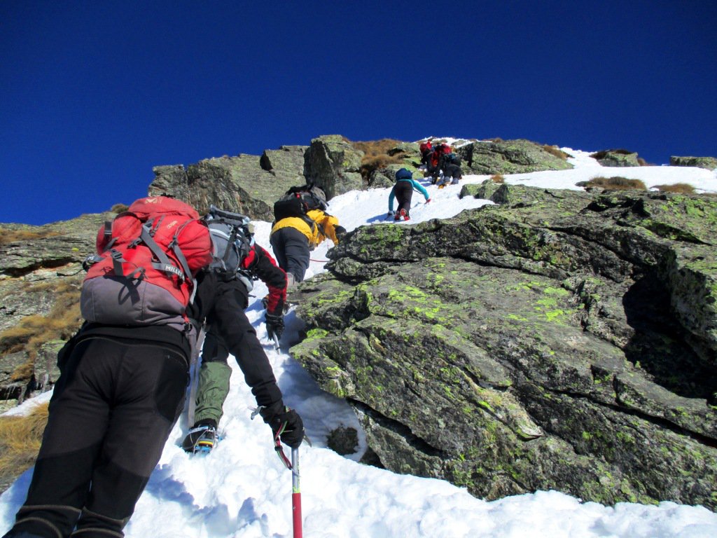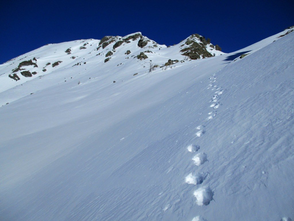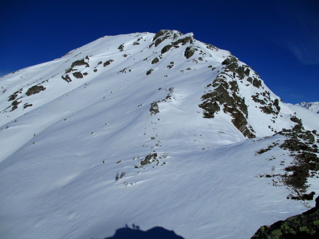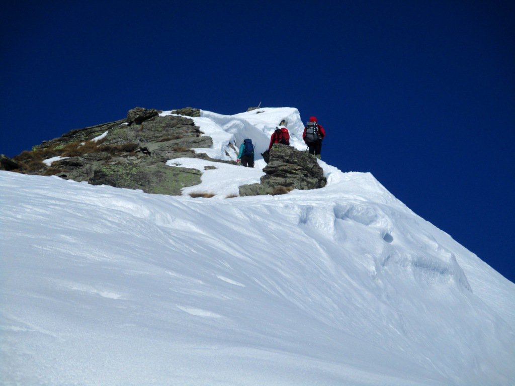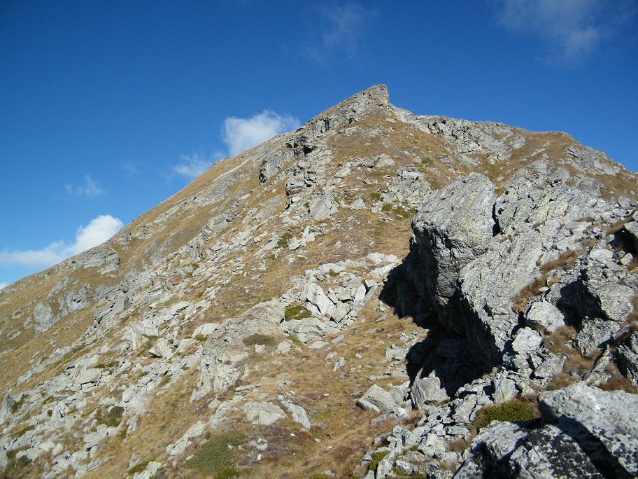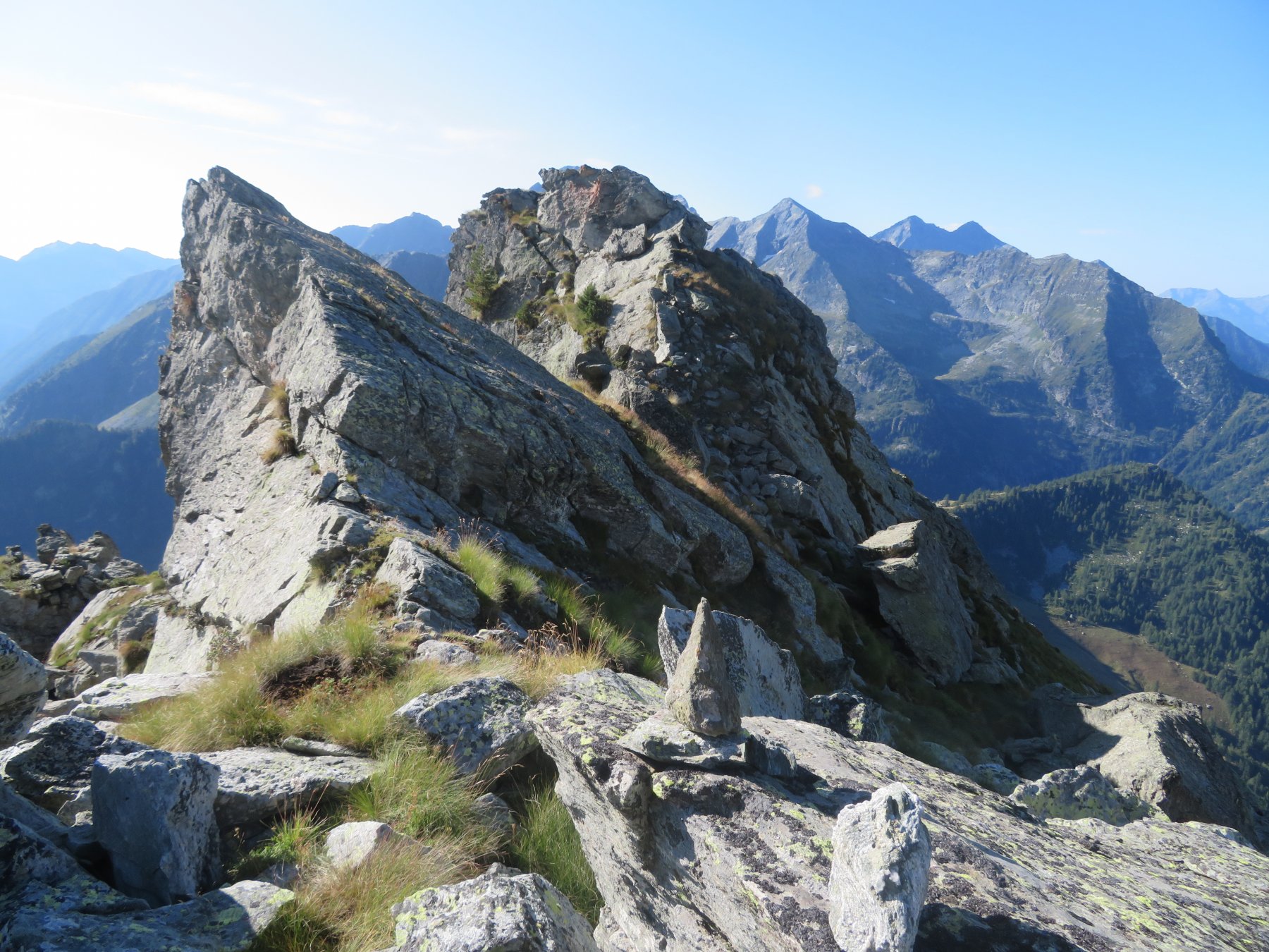 Quasi subito s’incontra un breve passaggio in discesa, su rocce abbastanza ripide ma articolate (7-8m I+ esposto), che bisogna scendere per toccare un colletto. Nel tratto seguente fino alla vetta si percorre la cresta di rocce affioranti ed erba.