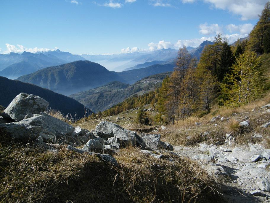 Da Estoul si prosegue sulla sterrata per il Colle Ranzola fino all’ A. Prabarmaso, dove proseguendo si superano quasi subito 2 tornanti e poco dopo la strada si sdoppia; mantenersi su quella bassa e, nei pressi di un tornante a sinistra, si segue il sentiero diretto che riconduce sulla strada.