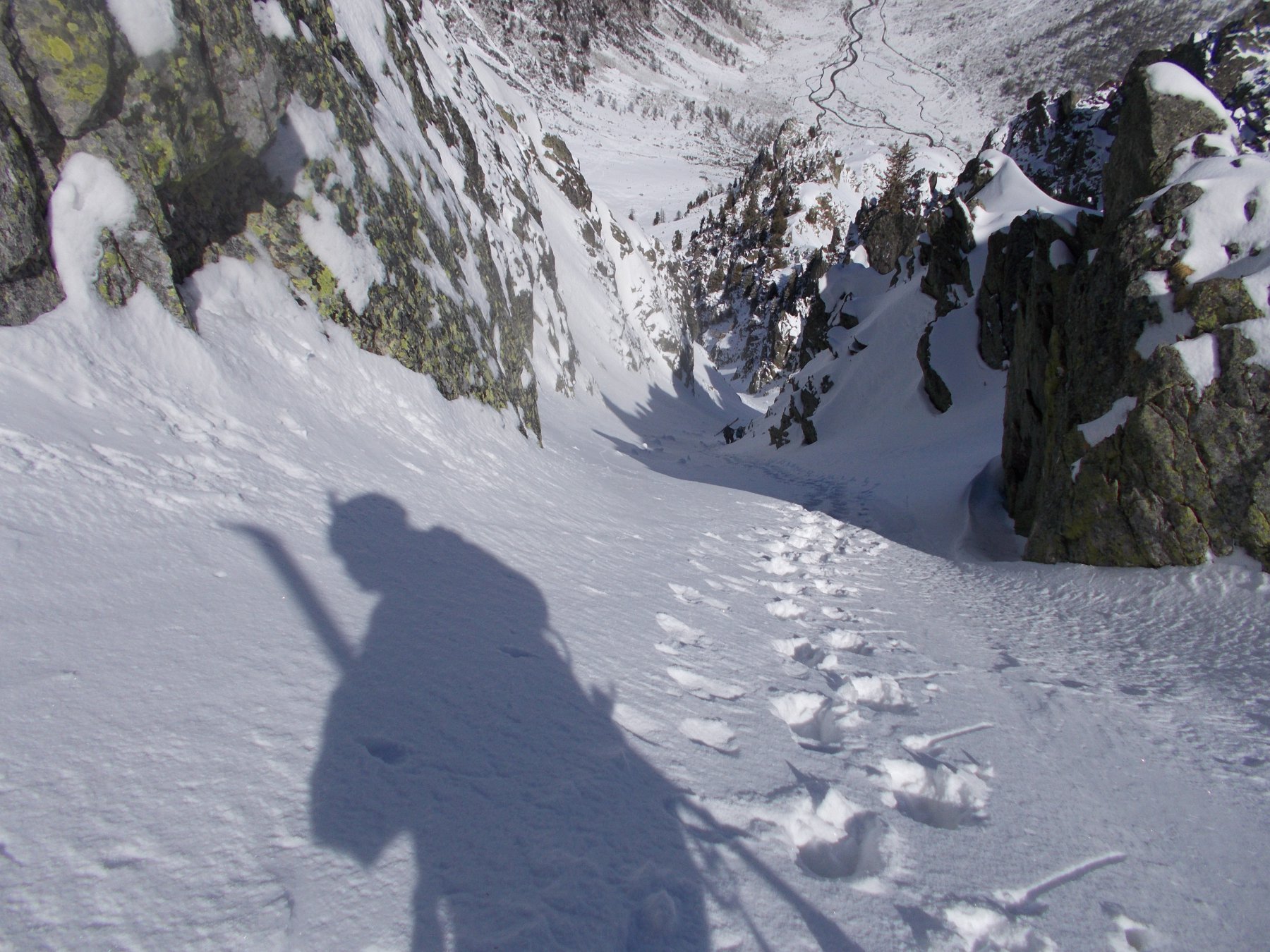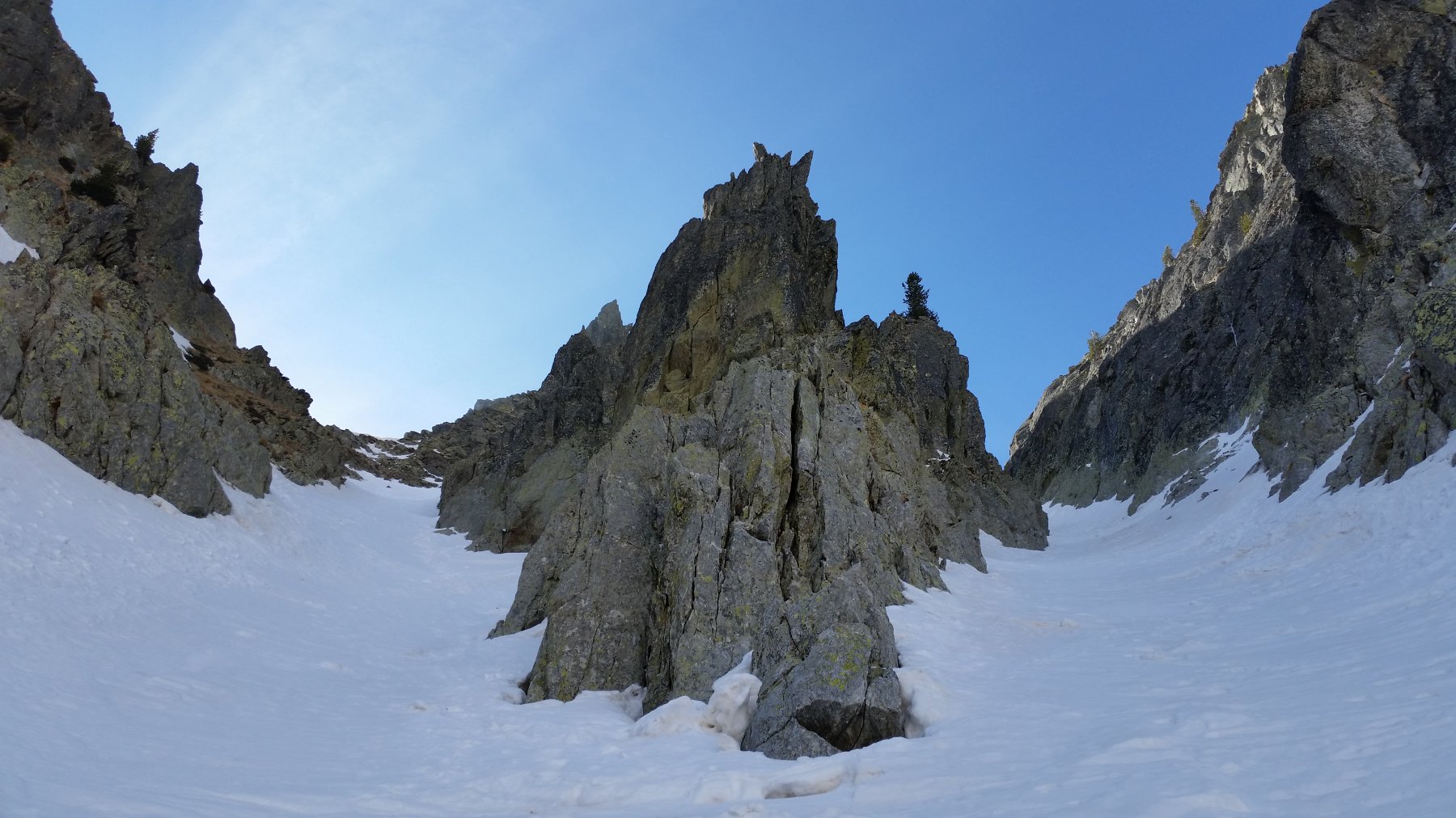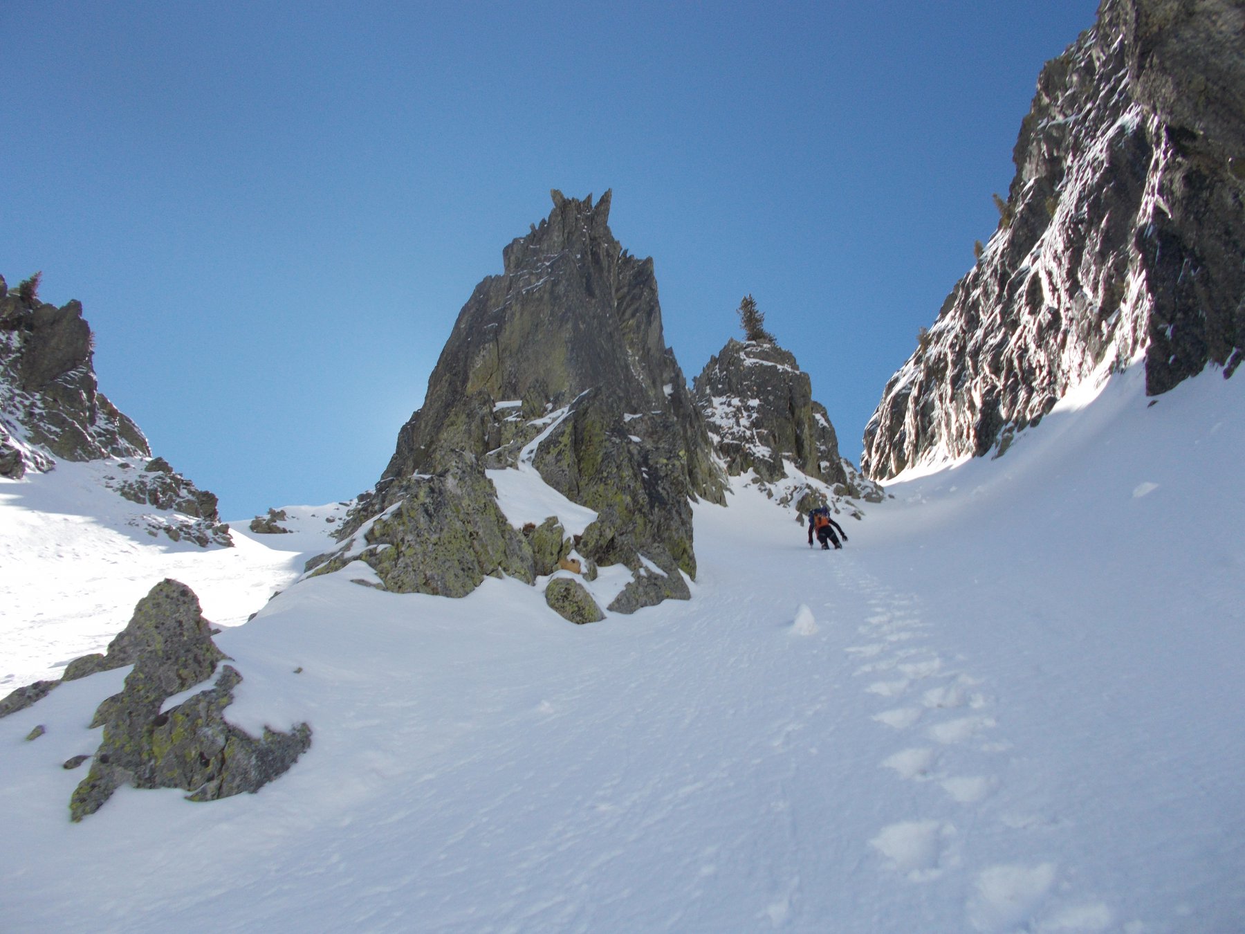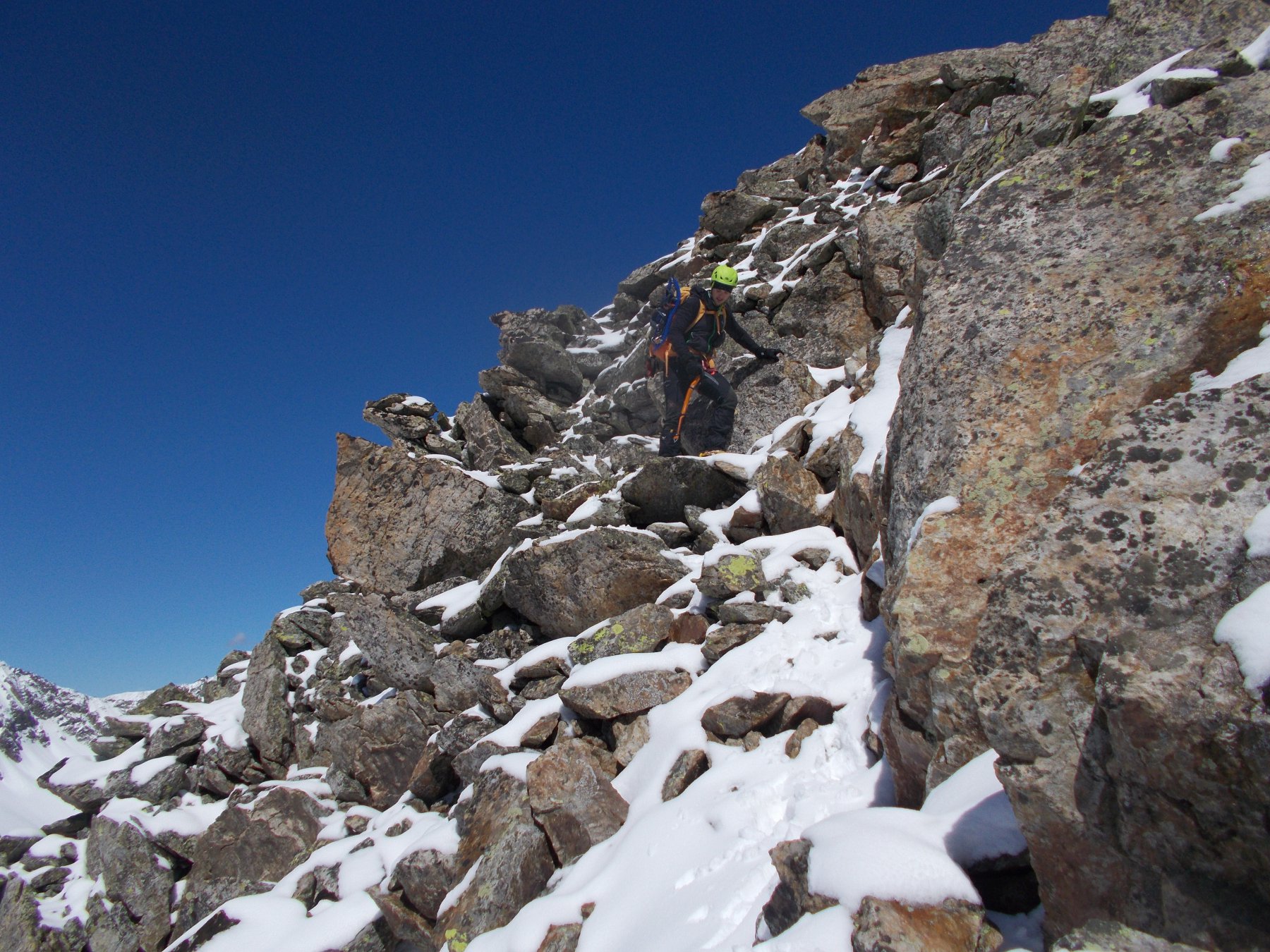 – ramo di dx (visibile dal basso) stretto e decisamente più ripido (45°/50°) con una strettoia e muretto breve a 55° circa, che porta al colletto e da qui brevemente per roccette sino al grande ometto di “vetta”;
