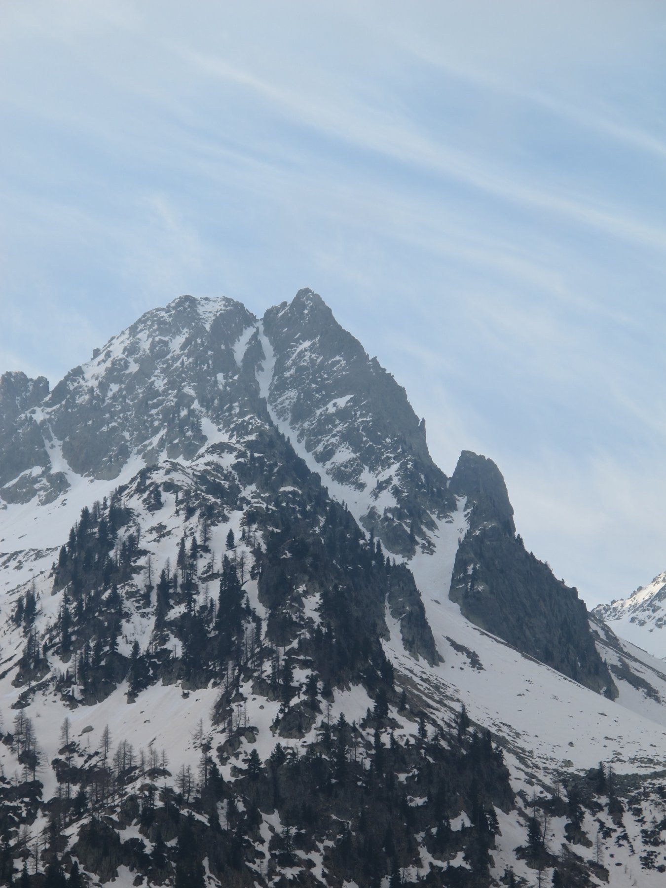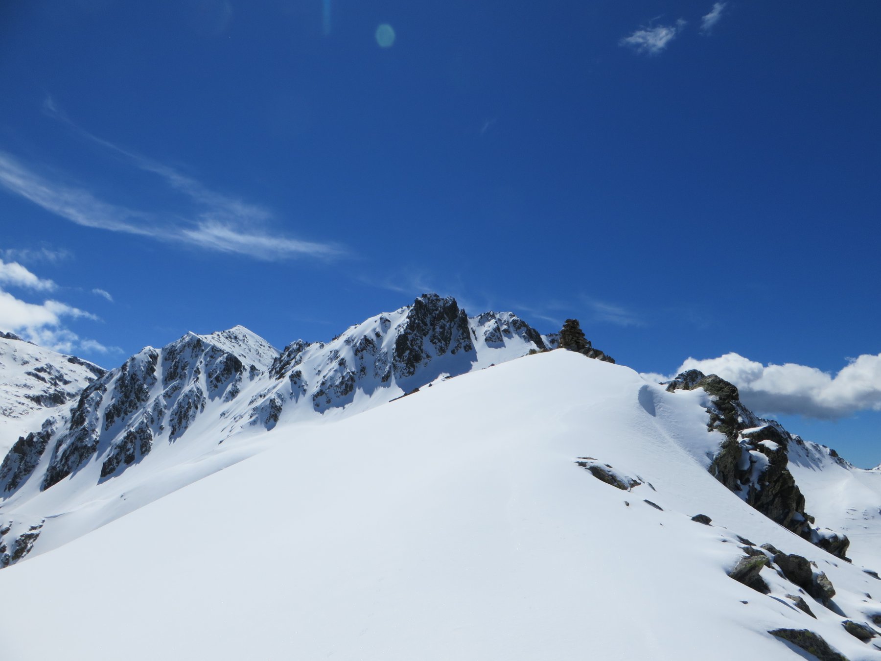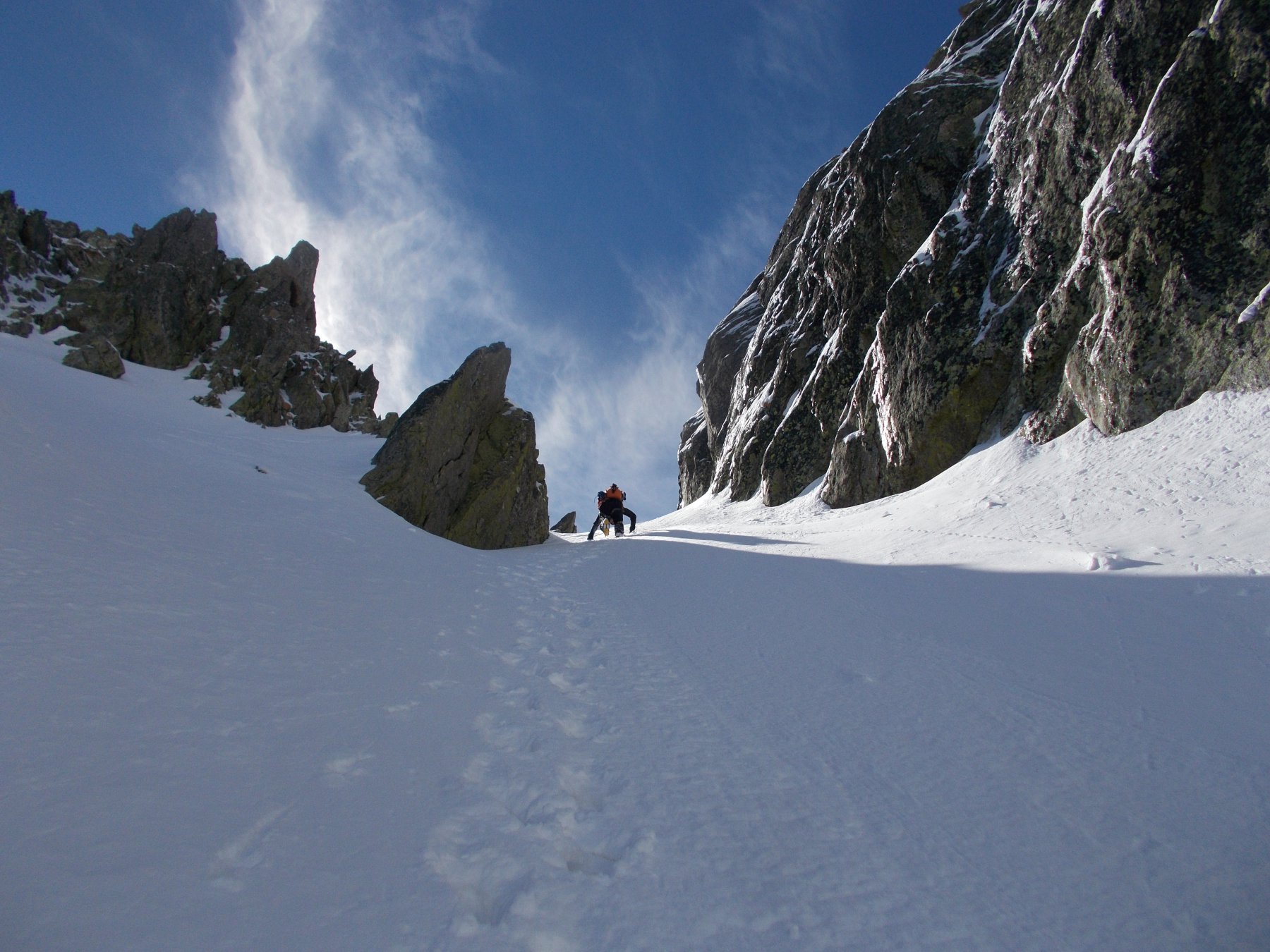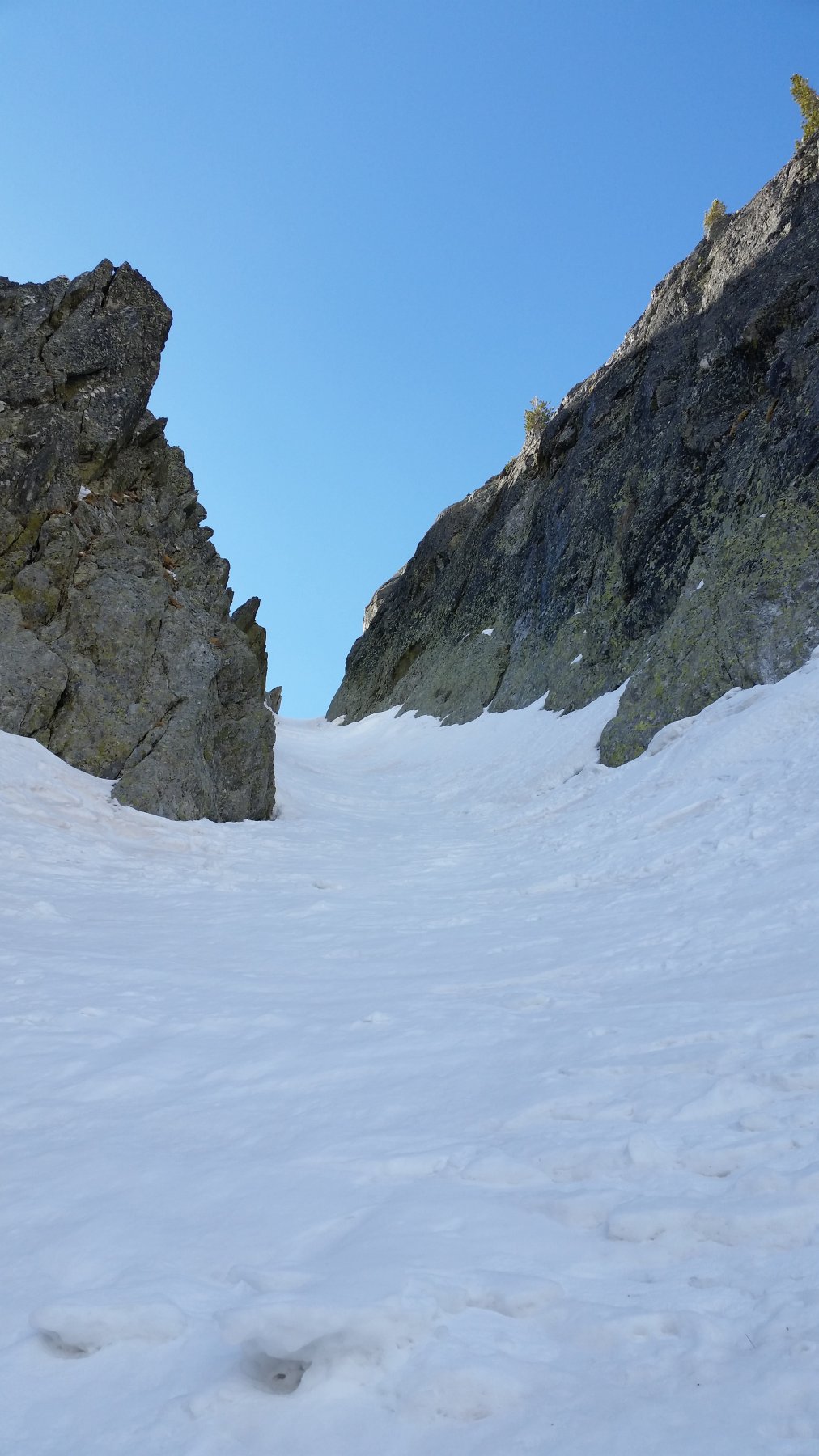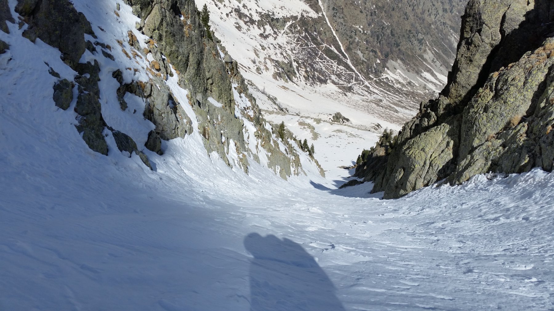 – ramo di dx (visibile dal basso) stretto e decisamente più ripido (45°/50°) con una strettoia e muretto breve a 55° circa, che porta al colletto e da qui brevemente per roccette sino al grande ometto di “vetta”;