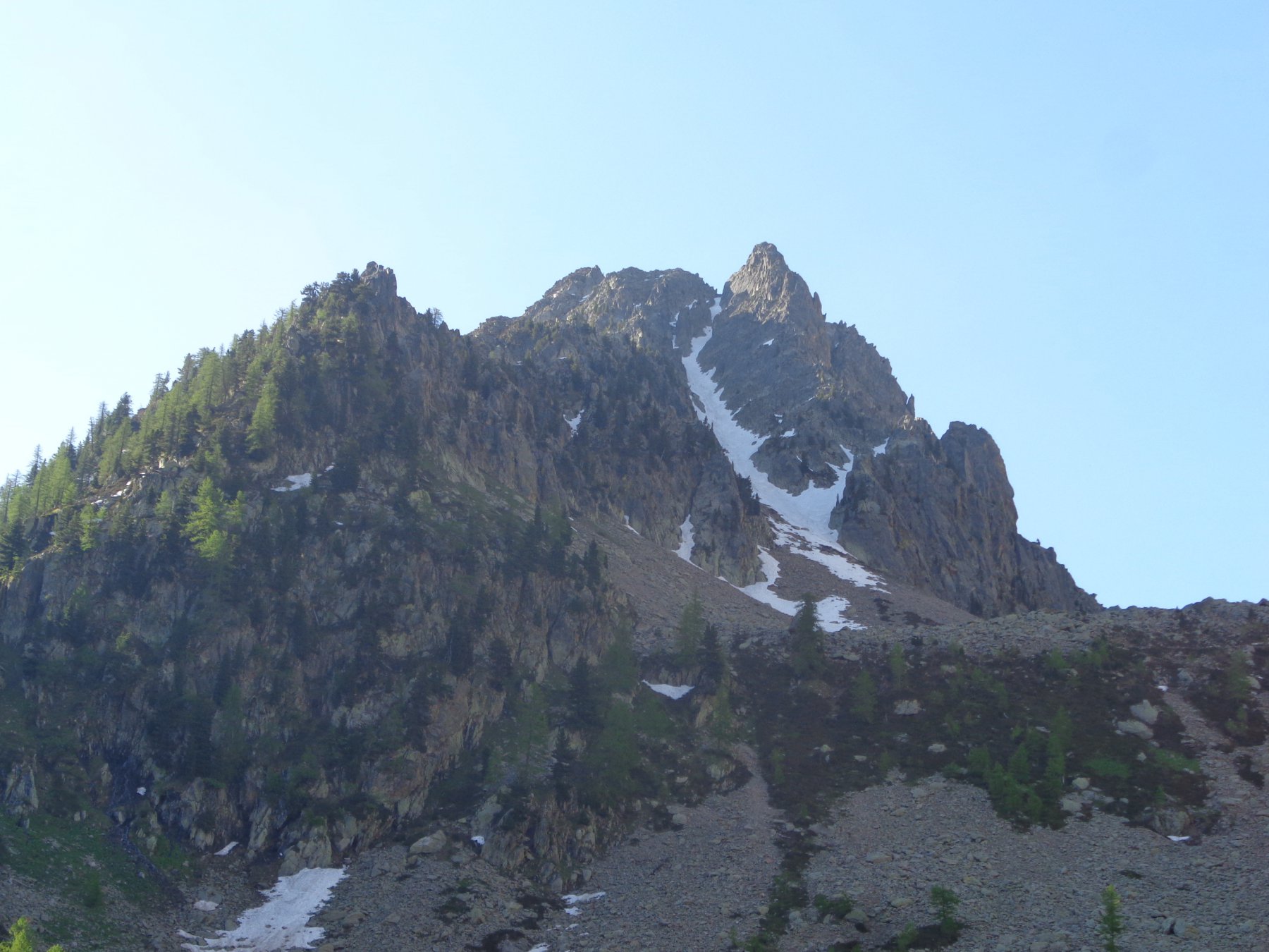 – ramo di sx (non visibile dal basso) stretto, ma decisamente meno ripido (45°), che porta ad spalla e da qui per roccette ed un ultimo pendio sino al grande ometto di “vetta”.