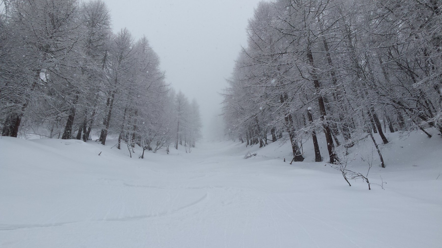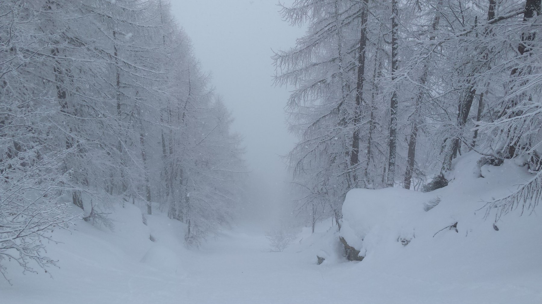 Prendo in prestito una sua foto per far capire l’ubicazione del canale. In partenza un paio di cm di farina che diventano una decina in quota. Stava nevicando in maniera molto blanda e non ho fatto fatica a ribattere la traccia. I cuscini sono belli morbidosi (ricoperti da tanta neve). Nella ripida strettoia è inevitabile far grattare gli sci sulle sponde rocciose del canale. Poi bello bello anche se sotto la farinella si sente il vecchio strato di neve dura.