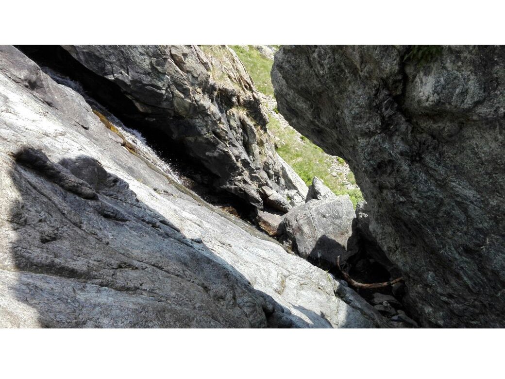 Seguire quindi il letto del torrente con percorso dettato dalla morfologia e da ometti in alcuni punti. Nella parte alta, quasi all’uscita sul sentiero normale da Niquidetto poco prima del laghetto del Civrari in corrispondenza della cascata, salire prima su enormi blocchi sotto una parete verticale, poi spostarsi a sx tenendo il tagliente del lastrone per discendere 3 mt. nell’evidente marmitta sottostante caratterizzata da un tronco curvo incastrato che serve da ponte.