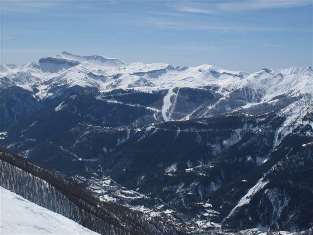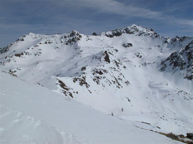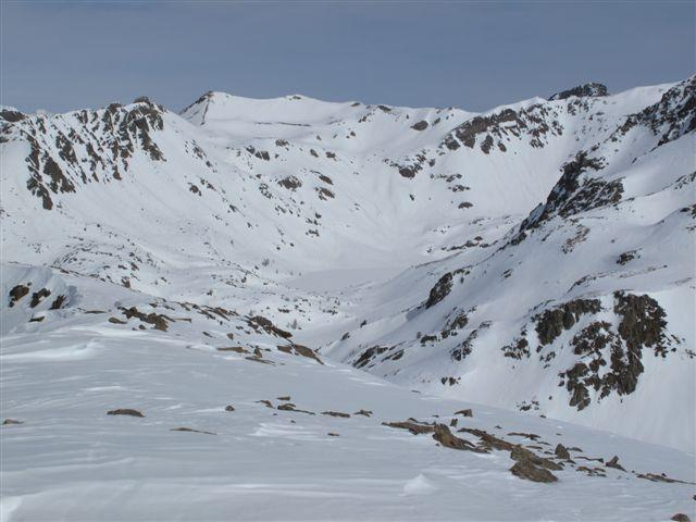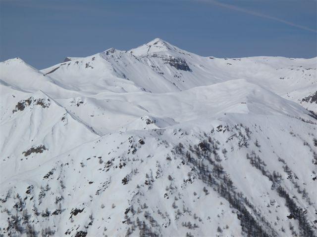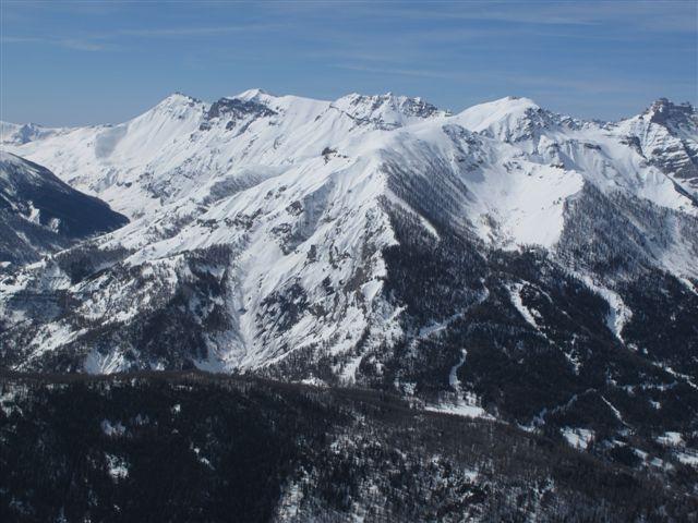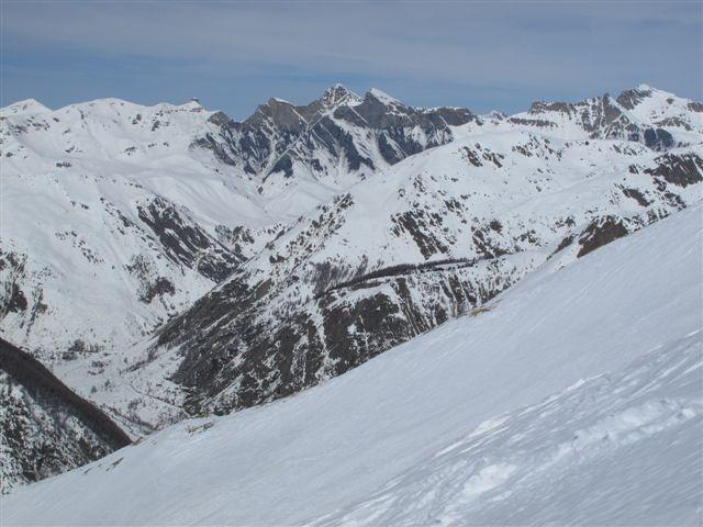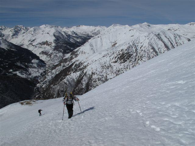 Mangiamo qualcosina e ci guardiamo intorno godendoci il bel panorama e il caldo sole. Antonello e Silvia con gli sci scendono e ci diamo appuntamento alla macchina dove ci aspetteranno dopo una bella bevuta in qualche bar, avranno una discesa molto bella e di soddisfazione!Lascio a loro la descrizione. Noi facciamo tutto il primo tratto con i ramponi, man mano che si scende si comincia a sfondare ma si va ancora bene. Nel tratto più ripido la neve ha mollato e dobbiamo mettere le ciaspole, in alcuni punti scendiamo bene, la neve marcetta sfonda un pò ma tiene, ma dobbiamo fare attenzione perchè il problema è che si alternano tratti con neve che tiene a tratti di pochi centimetri di neve marcetta con sotto il ghiaccio. Le ciaspole non tengono più e ad un certo punto l’unica soluzione che abbiamo è scendere con una scivolata controllata con la piccozza fino ai pendii un pò meno ripidi sopra alla stradina al ripiano delle Grange de Clai de Blachière e da lì tranquilli all’auto dove ci aspettano gli amici affamati e assetati che non son riusciti a trovare un bar aperto a Saint-Dalmas-le-Selvage.