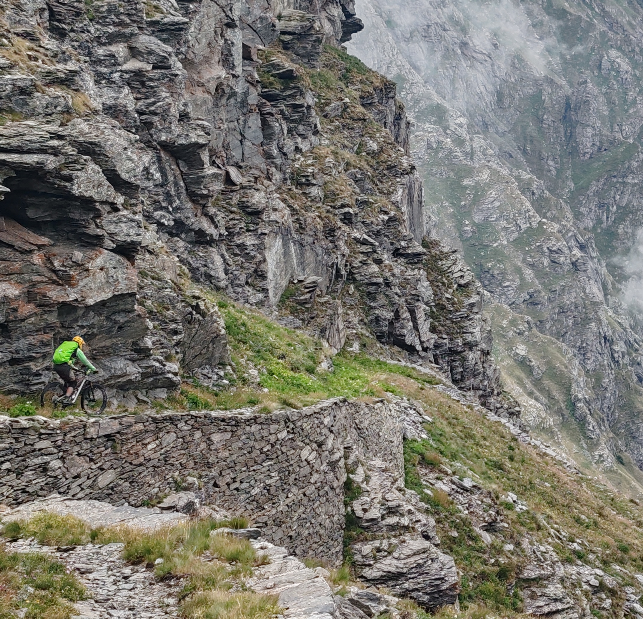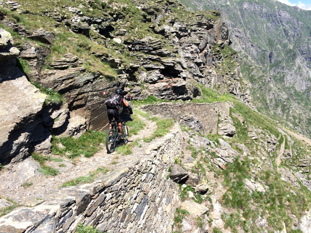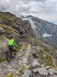 Si imbocca il sentiero che abbastanza ciclabile e tutto ben segnalato con tacche bianco rosse del GTA ci porta ad attraversare un paio di valloni molto impervi e selvaggi arrivando in circa 30 minuti ad una presa d’acqua dell’ENEL dove troviamo una strada che molto ripida ci porta all’ Alpe Tour a metri 2124.