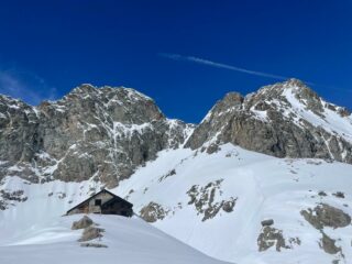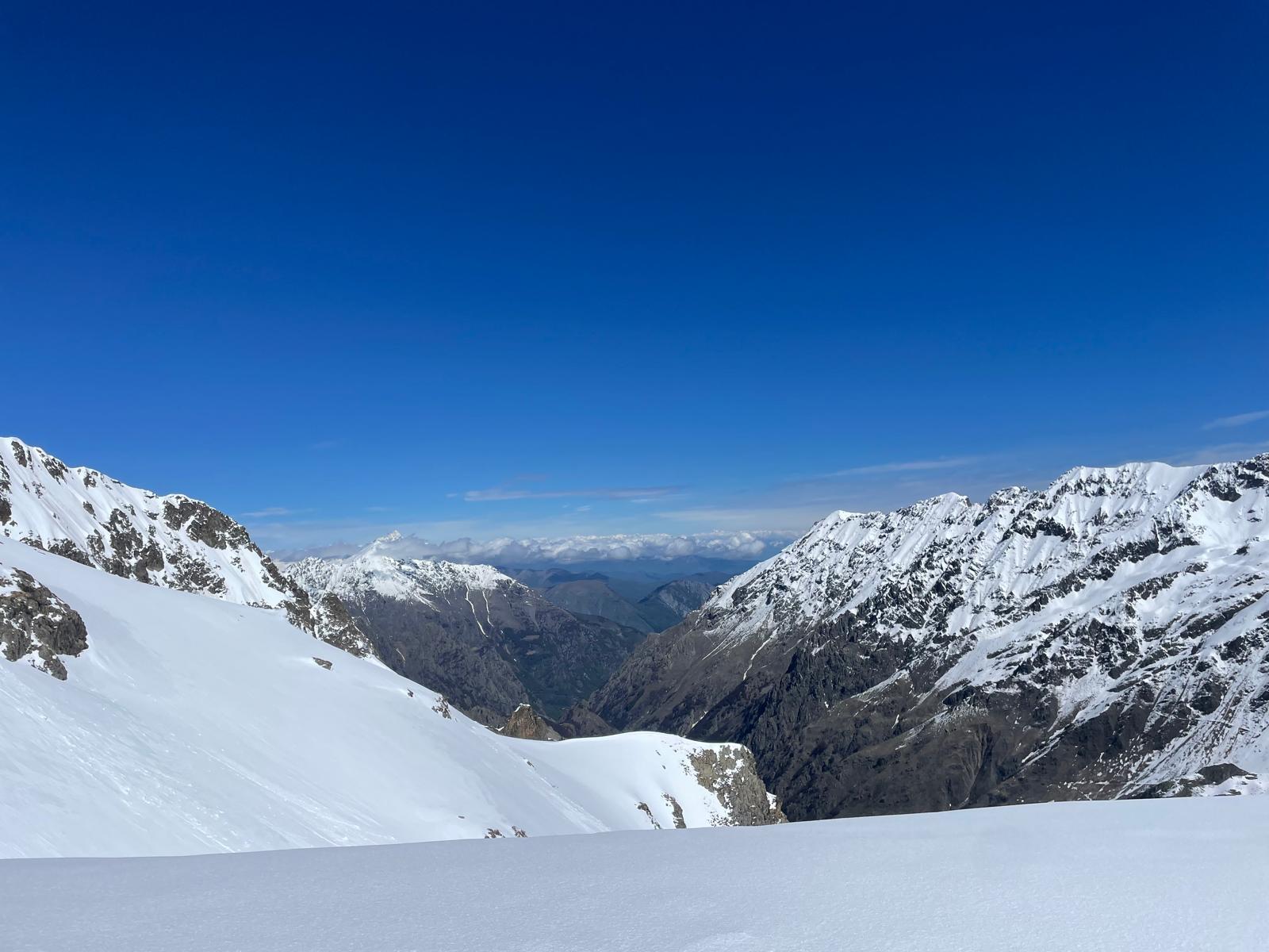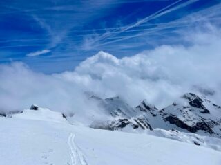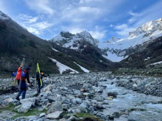 Giro tanto bello quanto lungo, che nonostante le difficoltà tecniche contenute pone qualche problema in più della classica gita di scialpinismo, a partire dall’ avvicinamento eterno (strada chiusa al bivio con il lago delle rovine (960 m). MTB fino al fondo del Pra del Rasur, dove abbiamo girato un po’ per trovare il punto dove attraversare il fiume senza guardare visto che il ponte non c’è ancora. Portage fino a 1850, poi neve portante fino in cima. Bella neve trasformata trasformata tranne sotto il passo di pagari dove c’era neve fresca tipo polistirolo.