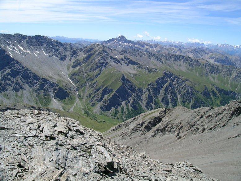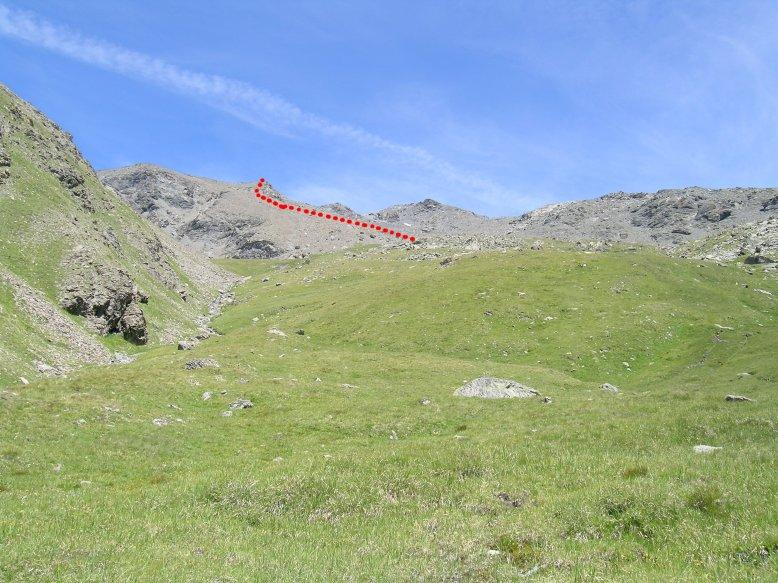 Qui si abbandona il centro del vallone trascurando le tracce che proseguono verso la Punta Ciatagnera, a favore di una quasi invisibile traccia sulla destra (fare riferimento ad alcuni affioramenti rocciosi) che sale i dossi erbosi che via via diventano più detritici. Si supera una zona con alcune sorgenti, e quindi entrati nel macereto di cui è costituita questa montagna, si continua in salita sfruttando una fascia sulla destra del pendio dove una lingua erbosa porta fino a circa 2900 m. In questa zona il sentiero diventa leggermente più marcato e si trovano diversi ometti, in ogni caso con buona visibilità non ci sono problemi di orientamento.