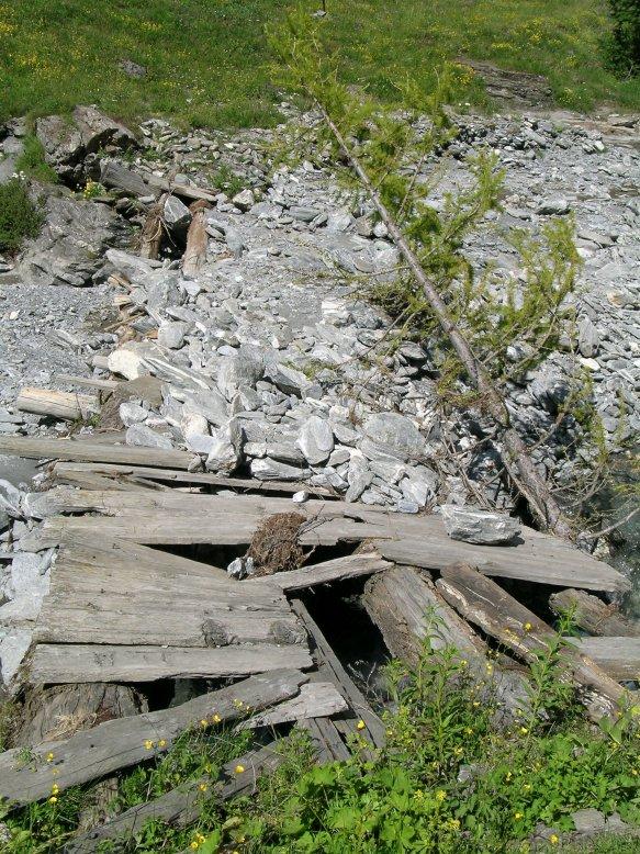 Dalle Grange di Thuras salire lungo la carrareccia che penetra nella Valle di Thuras e giunti nei pressi delle grange di Thuras superiore 2071 m scendere (palina con indicazione) ad attraversare il Torrente Thures sul Ponte Ciatagnera (abbastanza complicato, costituito da tronchi affiancati) a 2064 m.