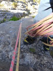 Dal sesto tiro abbiamo scalato al sole che ci ha cotti quindi siamo usciti in ferrata traversando a sx faccia a monte dopo S7.