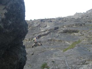 Salita notevole per la continuità della scalata con ben 5 tiri tra 6a+ e 6b+. Il più impegnativo è forse l’ottavo per un tratto di A0 affatto banale. Chiodatura ottima. L’accesso lungo la ferrata di roccia Clarì permette una discesa rapida su Claviere e si arriva all’attacco con le braccia già calde. Oggi temperatura ideale.