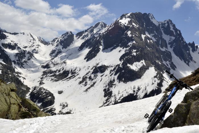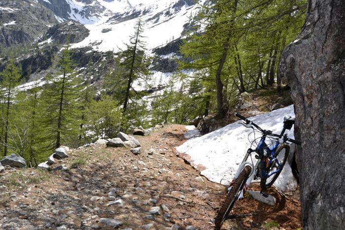 Causa neve continua dopo la galleria, ho ancora fatto qualche centinaio di metri di portage, poi ho posato la bici e ho proseguito un pezzo a piedi.