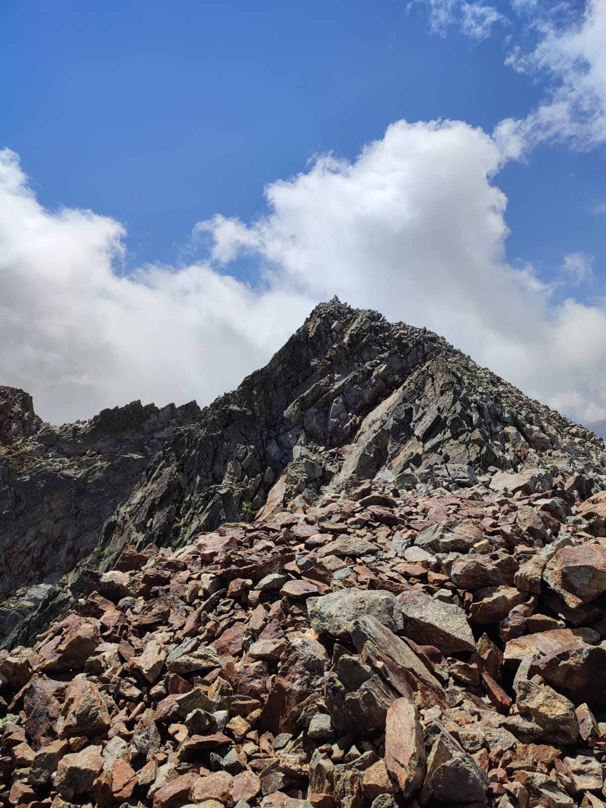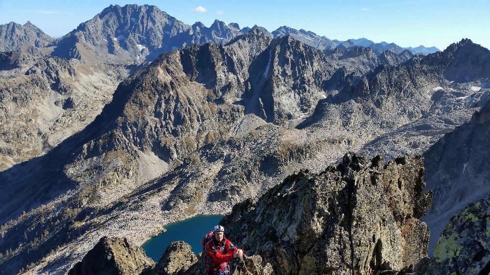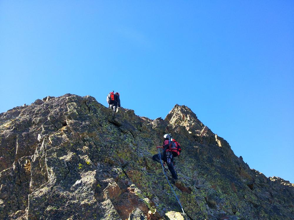Da questo torrione la salita si fa più interessante e continua nelle difficoltà (III), con alcuni passaggi esposti e con roccia non sempre buona (anche se ciò che serve è sempre ottimo), ma in breve si arriva a toccare la cima secondaria e poi la cima principale con facile percorso.
