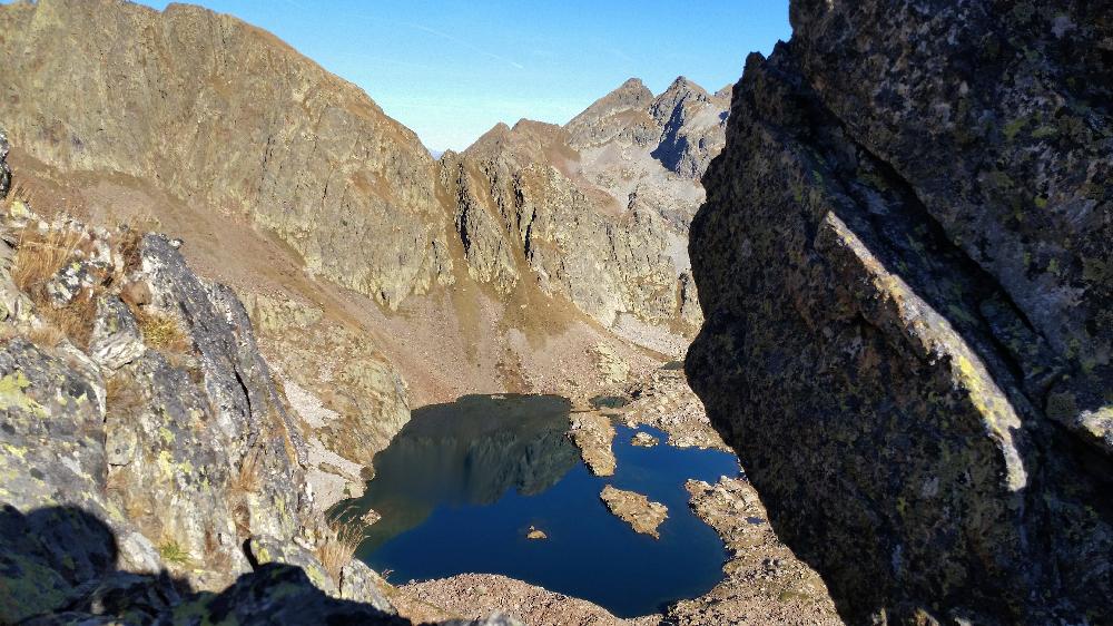 Per la discesa si segue l’itinerario inverso della via normale che scende verso nord – ovest per blocchi rocciosi, erba e pietrame fino alla Bassa del Claus (2720 m.) e da qui sul lato francese si attraversa il pendio della Cima della Lausa raggiungendo la Bassa della Lausa (2639 m.). Ora si scende il ripido pendio ricoperto di grossi blocchi instabili fino ad un nevaio praticamente sempre presente dal quale, con leggera salita, si va ad incrociare il sentiero che sale alla Bassa del Druos (2628 m.). Deviando a destra si scende per la bella mulattiera che solca tutta la Valscura fino al suo lago inferiore e da qui, con numerosi tornanti, va a riprendere il percorso di salita sino alle Terme.