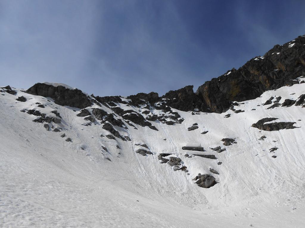 Anche se la militare consente una salita abbastanza agevole il portage, nelle attuali condizioni di magra, è notevole (inizio neve all’ altezza della galleria). Laghi già in fase di disgelo, neve comunque ben portante sino alla bassa della Lausa. Dal colletto scesi direttamente sul versante francese sino alla base della paretina (evitato il traverso in quota sulla traccia estiva, per quanto sgombra da neve). Salita su neve ben ramponabile, tratto centrale con pendenza più importante, che poi si riduce nella parte finale.