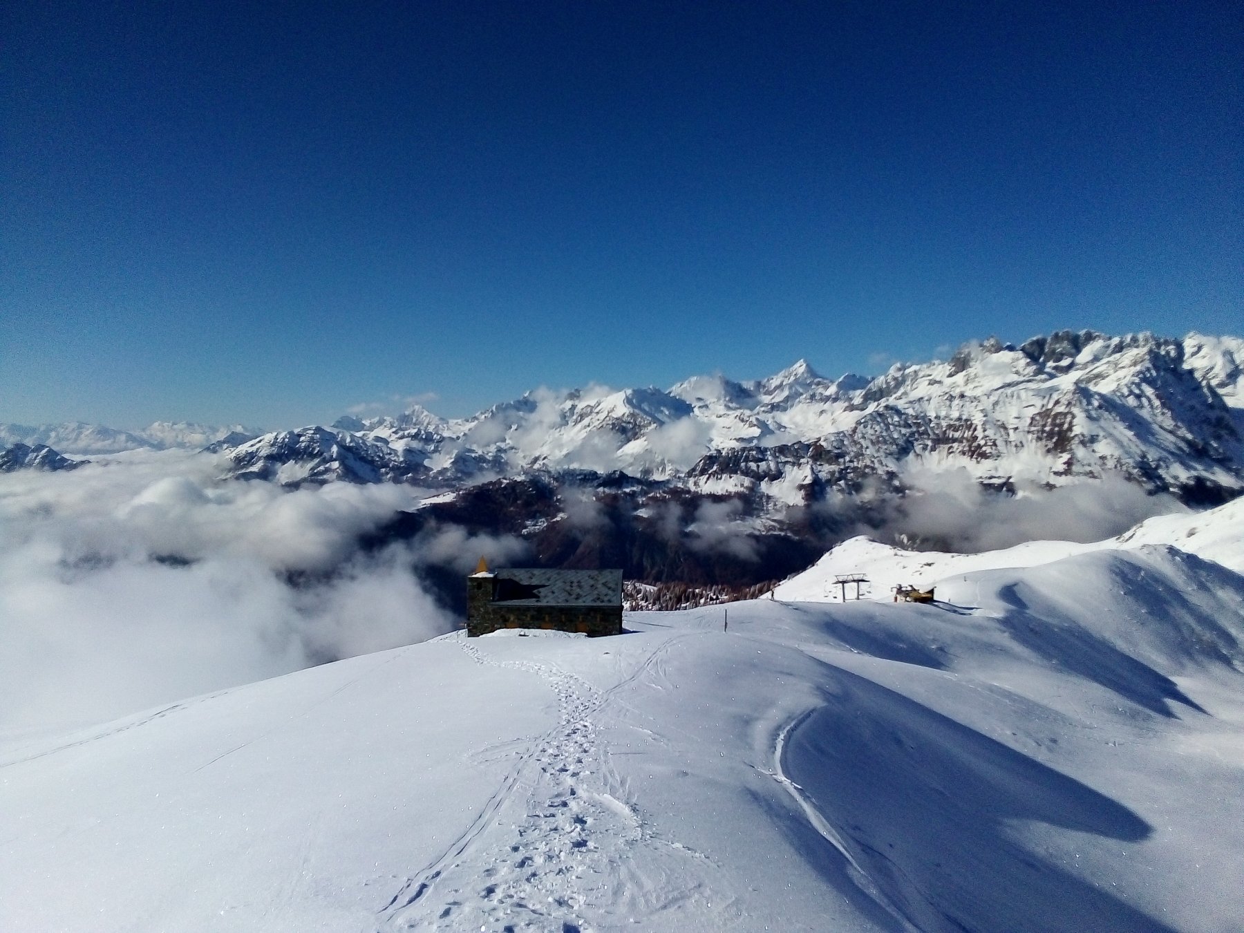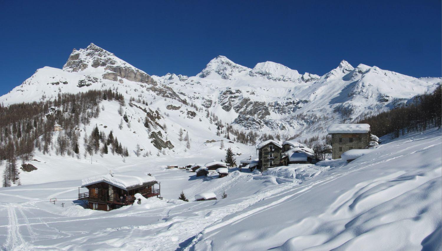 Proseguire tenendo la destra dei fabbricati del villaggio sino a una palina segnaletica, per poi svoltare a sinistra nel bosco: su una traccia sempre molto evidente in poco più di un’ora si arriva al santuario Clavalitè, poco distante dall’arrivo della seggiovia che sale da Chamois al colle Fontana Freida.